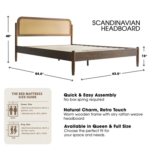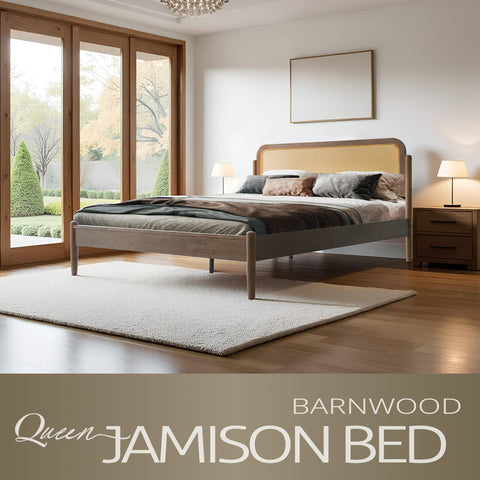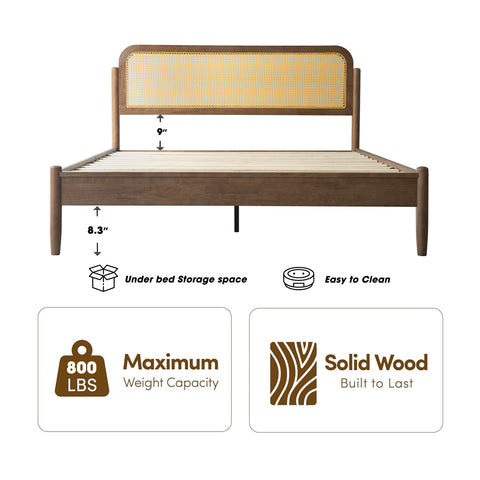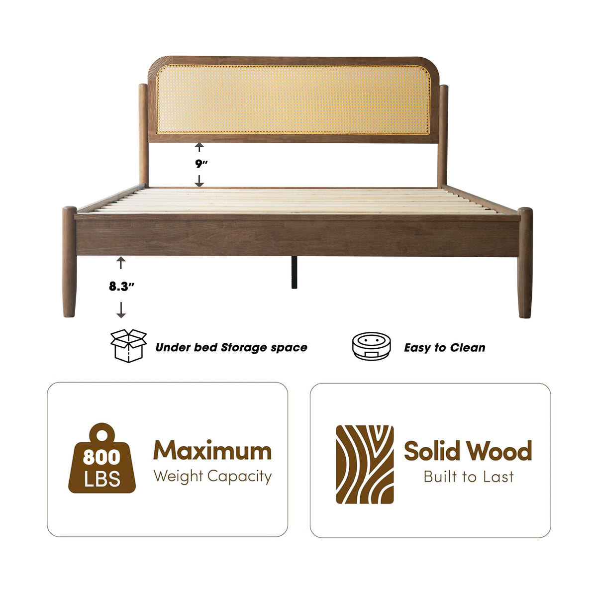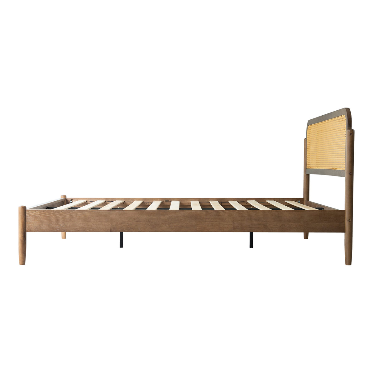 Transform your bedroom with the Jamison Queen Size Bed Frame by East West Furniture, a perfect blend of natural charm and lasting durability. Made from 100% solid Hevea wood (Rubberwood), this bed frame features a rich Barnwood finish that brings warmth and character to your space. The beautifully designed rattan Panel webbing headboard adds texture and a touch of vintage style, creating a cozy and inviting atmosphere. Built for strength and comfort, the Jamison Bed includes 12 heavy-duty wooden slats reinforced by metal center legs, providing firm mattress support and a weight capacity of up to 800 lbs. Its anti-slip and noise-free structure ensures stability and quiet comfort all night long. With 8.3 inches of under-bed clearance, it offers ample space for convenient storage and easy cleaning. Standing 15 inches high with a 40-inch headboard, this platform bed delivers a balanced, elegant look. No box spring is required, and assembly is quick and simple with all tools included. Rounded corners, smooth edges, and a fine wood grain finish highlight East West Furniture’s attention to detail and superior craftsmanship. The Jamison Bed is a stylish and sturdy centerpiece that enhances both the beauty and functionality of your bedroom.