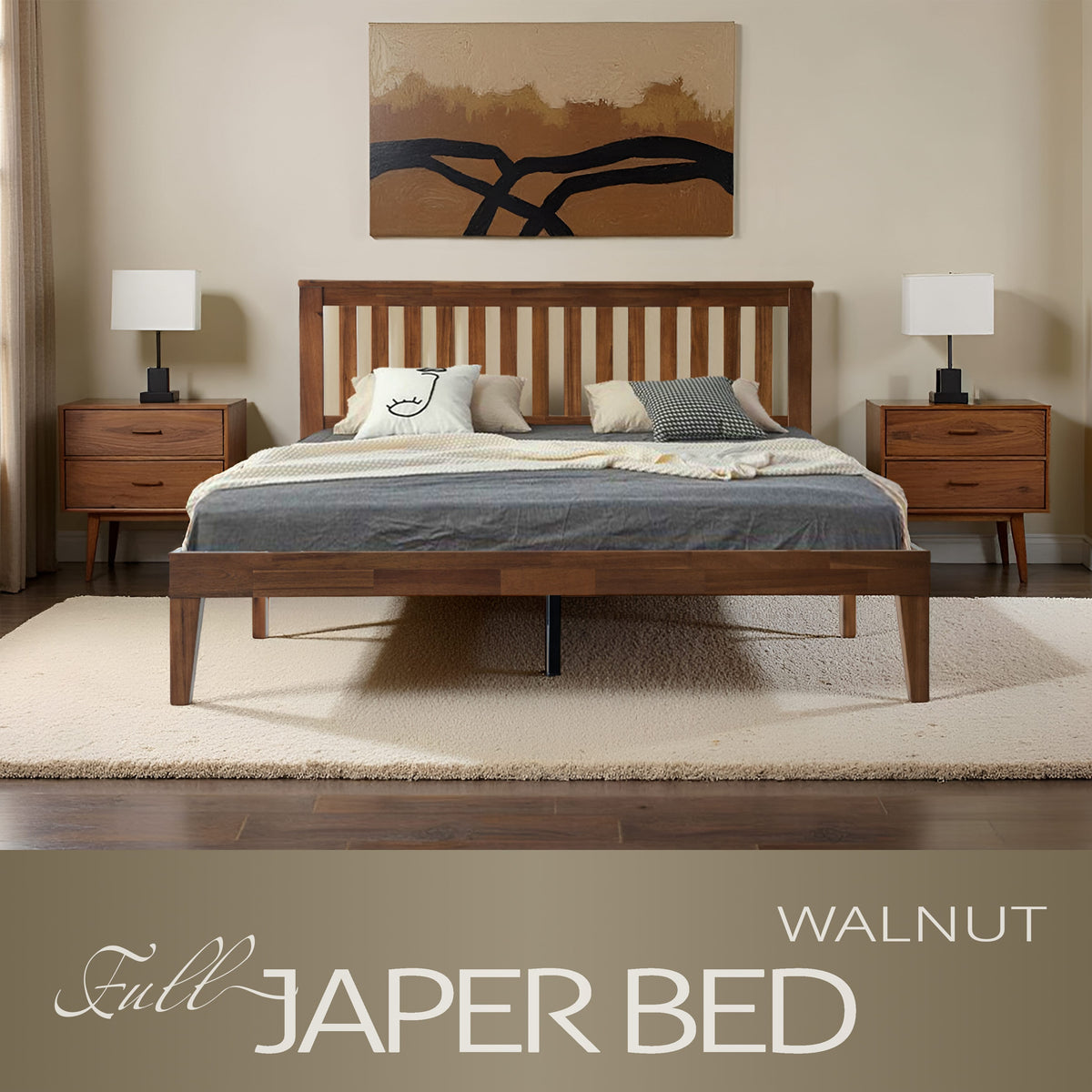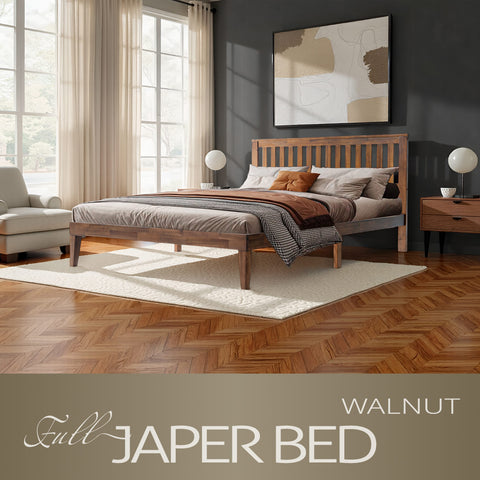 Elevate your bedroom with the timeless elegance of the Japer Full-Size Bed Frame, expertly crafted from 100% solid wood for enduring strength and natural charm. Featuring a minimalist slatted headboard and a rich walnut finish, this bed brings warmth and sophistication to both modern and classic spaces. The 12-slat solid wood platform, reinforced with sturdy metal center legs, ensures exceptional stability and silent support no box spring needed. With a weight capacity of up to 800 lbs, the Japer Bed delivers lasting durability and dependable comfort for years to come. Every detail, from the smooth finish and refined back panel to the neat screw covers, showcases East West Furniture’s attention to quality and craftsmanship. The 8.5-inch under-bed clearance provides convenient storage space, while the 6.9-inch gap below the bottom rail allows for easy cleaning. Simple to assemble and designed to last, the Japer Bed perfectly blends modern simplicity, robust construction, and elegant design ideal for creating a cozy, stylish bedroom retreat.