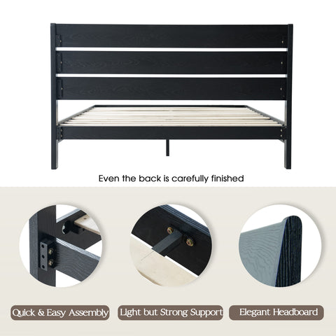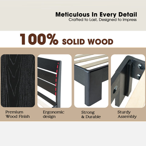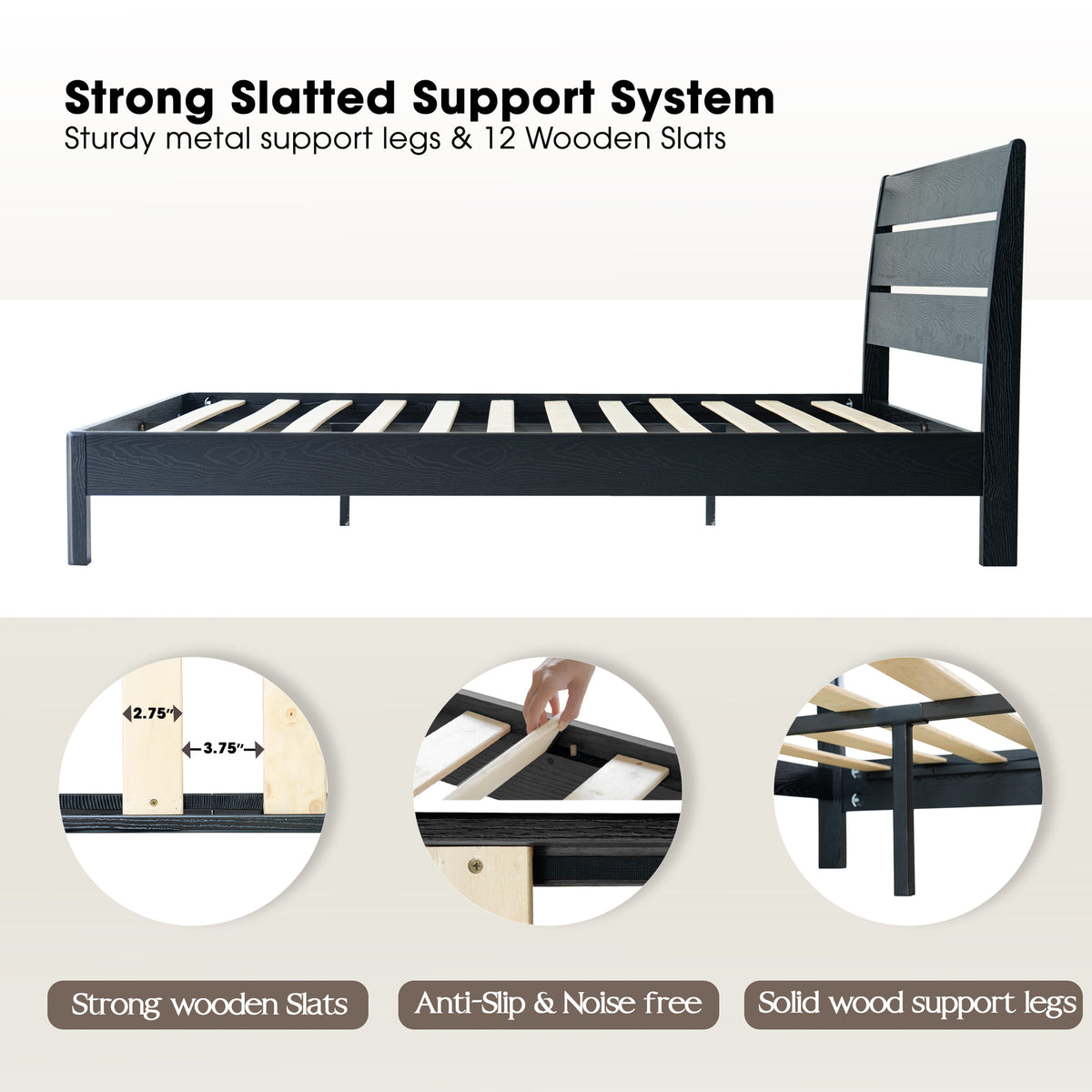Queen Size Solid Wood Platform Bed Frame with Headboard & Footboard, Metal Legs with 12 Durable Slatted Base, Easy Assembly, No Box Spring Needed, Noise-Free & Anti-Slip, Ebony Oak Finish, QIQ-35