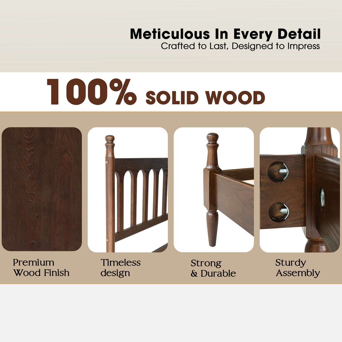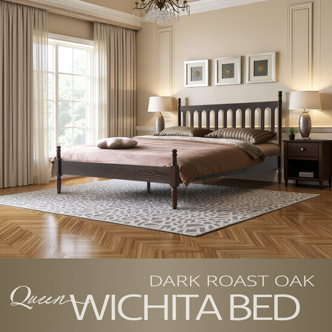 Enhance your bedroom with the classic appeal and sturdy craftsmanship of the Wichita Queen Size Bed Frame. Built from 100% solid wood (Rubberwood), this platform bed delivers lasting durability and natural beauty. The elegant Dark Roast Oak finish paired with a Vintage Elegance Style headboard and footboard design creates a warm, timeless look that blends effortlessly with any décor. The Wichita Bed Frame is equipped with 12 solid wooden slats and metal center legs, ensuring strong mattress support, stability, and a weight capacity of up to 800 lbs. Its anti-slip and noise-free structure guarantees a peaceful, restful night’s sleep without the need for a box spring. With 9.6 inches of under-bed clearance, you’ll have convenient storage space for boxes, luggage, or seasonal items. Crafted with precision and attention to detail, this bed frame features smooth edges, concealed screw covers, and a carefully finished back - showcasing East West Furniture’s dedication to quality and style. Simple assembly with included tools ensures quick setup and long-lasting use.
