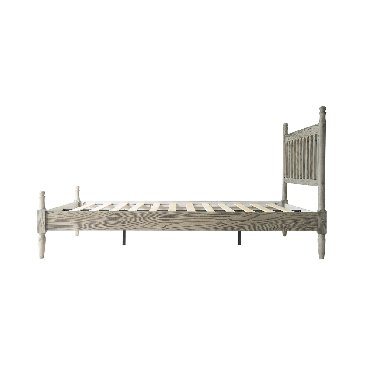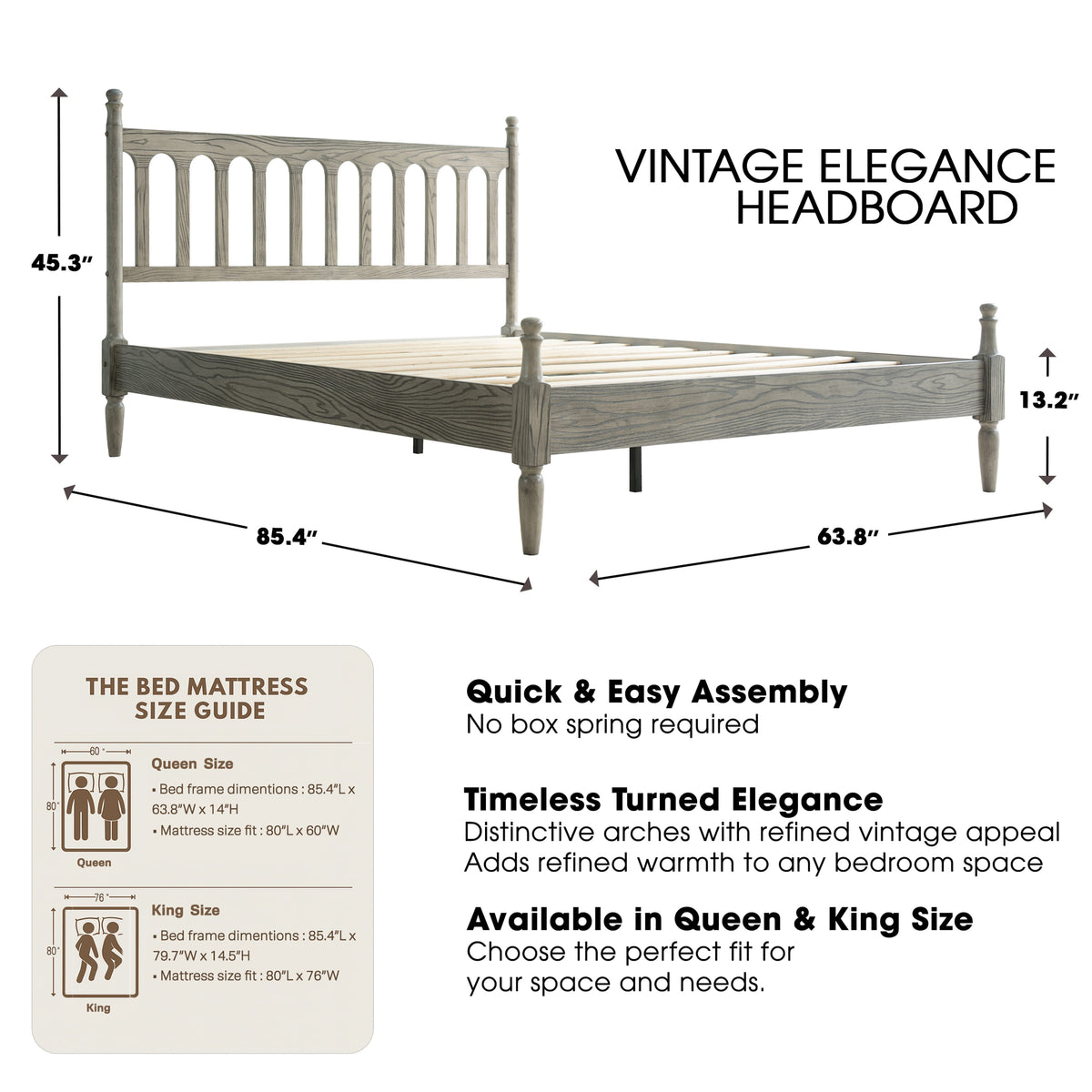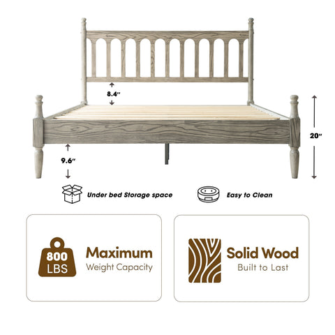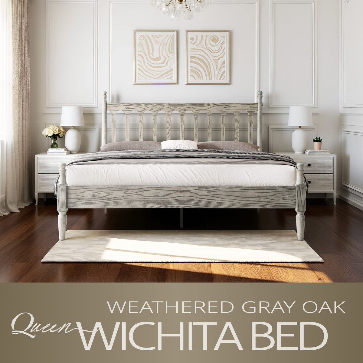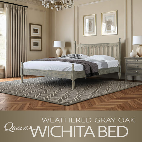 Add timeless charm and lasting quality to your bedroom with the Wichita Queen Size Bed Frame. Expertly built from 100% solid Hevea wood (Rubberwood), this platform bed combines exceptional strength with a naturally elegant design. The Weathered Gray Oak finish and vintage-inspired headboard and footboard create a refined, rustic look that enhances both classic and modern interiors. The Wichita Bed Frame includes 12 strong wooden slats reinforced by metal center legs, providing exceptional stability, durability, and support for up to 800 lbs. Its slip-free and noiseless structure ensures a quiet, comfortable sleep experience - no box spring required. With a 9.6-inch clearance beneath the frame, it offers convenient under-bed storage for boxes, bags, or seasonal items while allowing easy cleaning access. Finished with smooth edges, screw covers, and a neatly crafted back, this bed showcases East West Furniture’s commitment to detail and craftsmanship. Quick and easy assembly makes setup simple, and the sturdy design ensures long-lasting reliability.