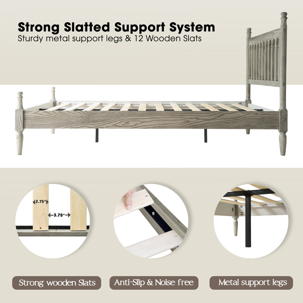 Queen Size Bed Frame, Solid Wood Platform Bed with Headboard & Footboard, Central Metal Legs, 12 Sturdy Slatted Base, Anti-Noise & Slip-Free, No Box Spring Needed, Weathered Gray Oak Finish, WCQ-34