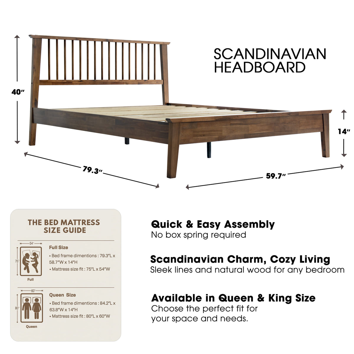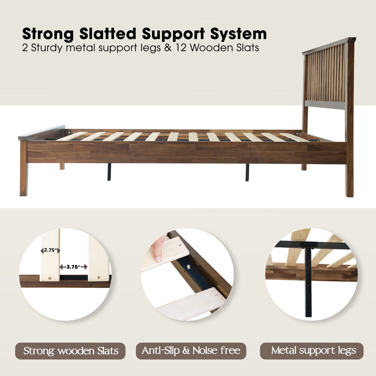 • Platform Support: 12 Durable Wooden Slats + Metal Center Legs