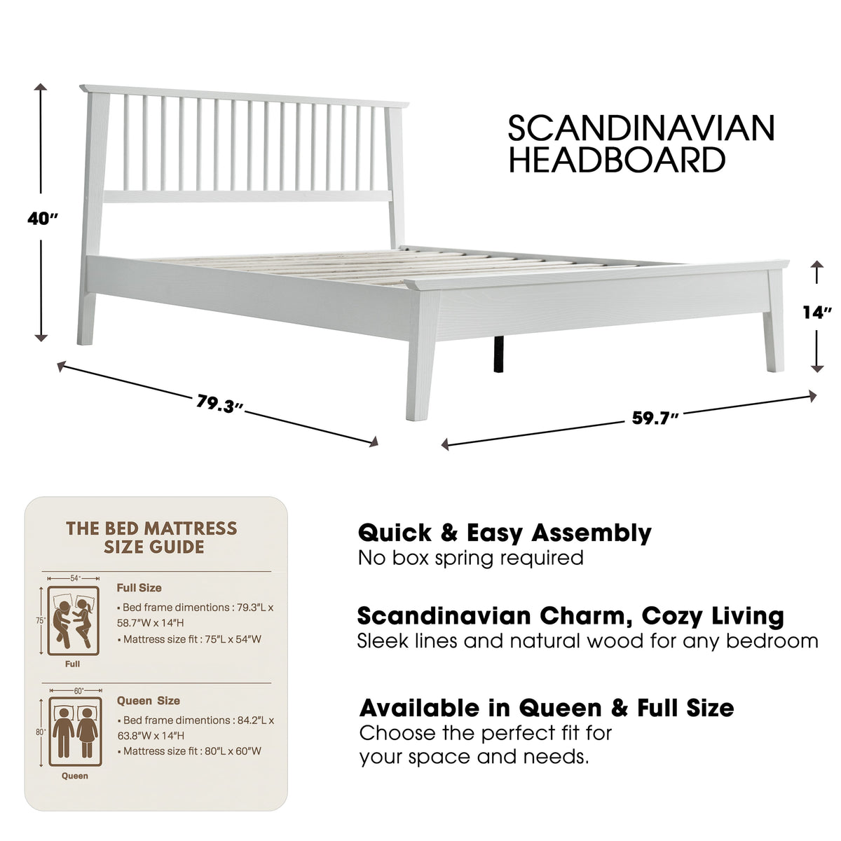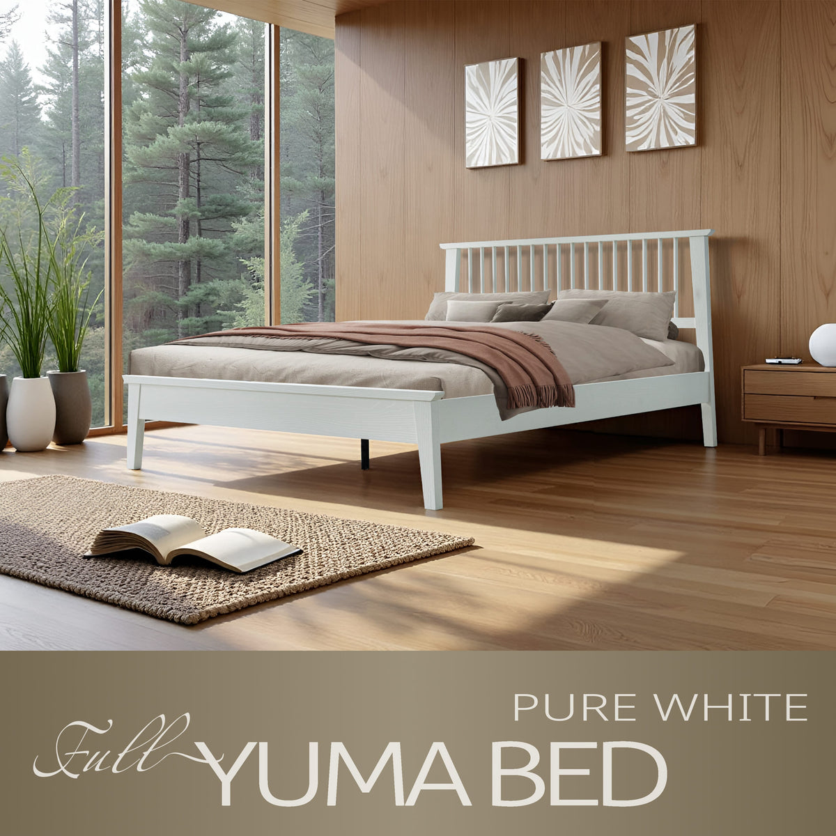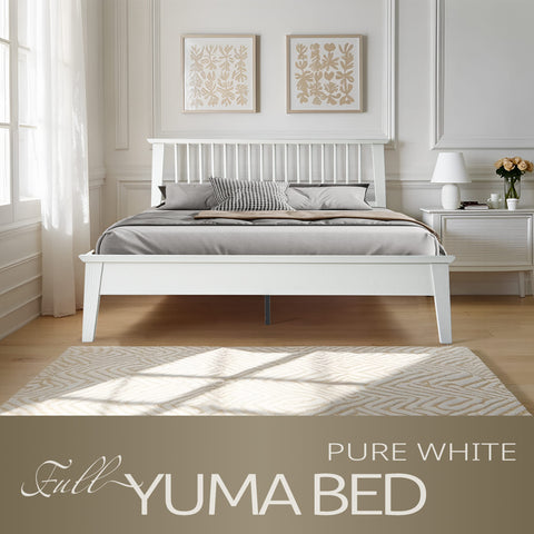 Transform your bedroom with the Yuma Full Size Platform Bed - a perfect blend of comfort, simplicity, and lasting elegance. Expertly crafted from 100% solid Hevea Wood (Rubber wood), this bed frame delivers exceptional durability and natural charm. The Pure White finish highlights the wood’s subtle grain, brightening your space and complementing any modern or décor. Featuring a sleek 40-inch slatted headboard and matching footboard, the Yuma bed offers a clean, balanced look that adds warmth and sophistication to your bedroom. Its 14-inch solid wood platform base includes 12 sturdy wooden slats and reinforced metal center legs for stable, noise-free support - no box spring required. The non-slip design keeps your mattress secure for a safe and restful experience. Designed for convenience, this bed frame assembles quickly with the included tools, and its smooth finish makes cleaning effortless - simply wipe to maintain a fresh look. Whether placed in a master suite or guest room, the Yuma Full Bed brings enduring comfort, style, and the trusted craftsmanship of East West Furniture.