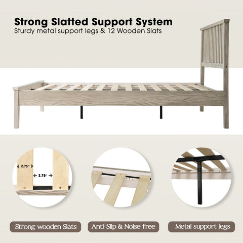 Queen Size Platform Bed Frame with Solid Wood Headboard & Footboard, Center Metal Legs, 12 Durable Slatted Base, No Box Spring Needed, Noise-Free & Slip-Free, Driftwood Gray Oak Finish, YUQ-33