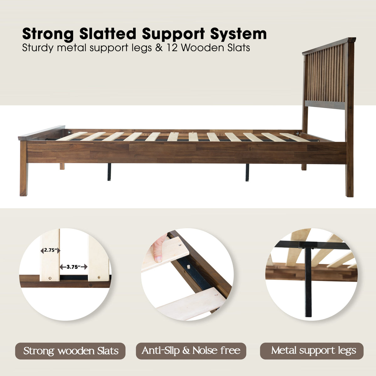 Queen Size Solid Wood Platform Bed Frame with Headboard & Footboard, Centre Metal Legs, 12 Sturdy Slatted Base, Easy Assembly, No Box Spring Needed, Noise-Free & Slip-Free, Walnut Finish, YUQ-37