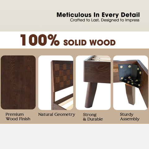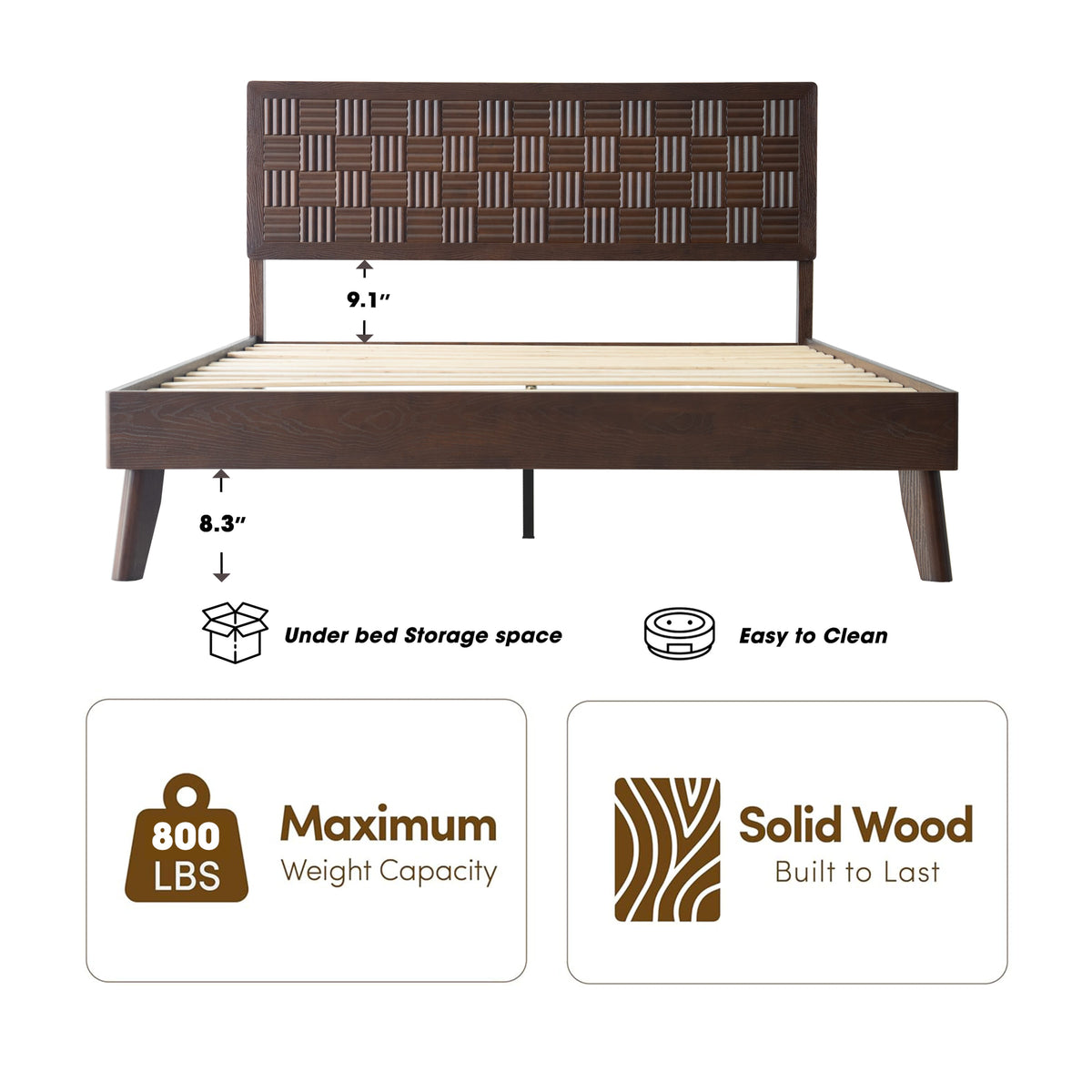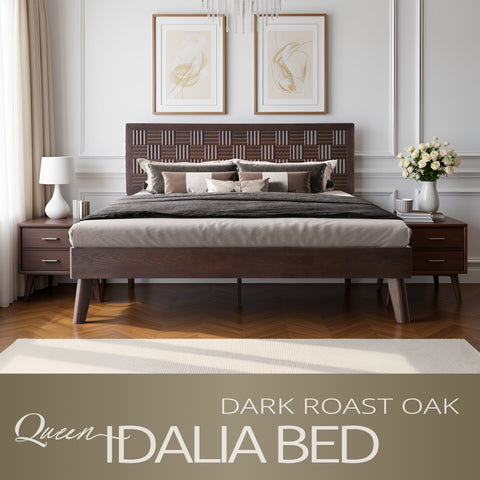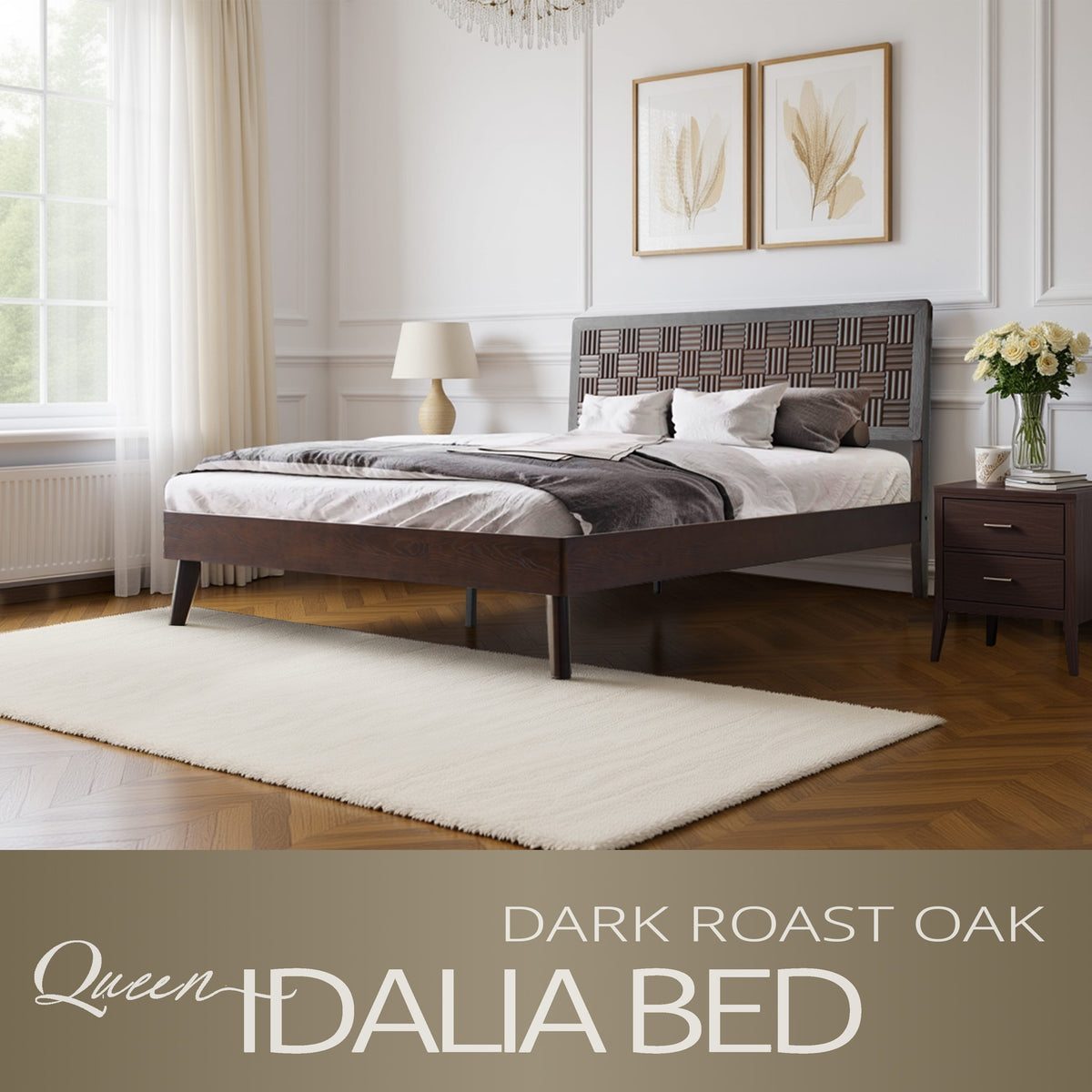 The Idalia Queen Size Bed Frame brings timeless charm and reliable comfort to your bedroom, making it the perfect centerpiece for your space. Expertly crafted from 100% solid wood, it features a rich, Deep Dark Roast Oak finish that highlights the natural beauty of real wood grain. The modern headboard with its Geometric Pattern adds a touch of contemporary flair, while the slightly angled backrest offers cozy support for reading or relaxing after a long day. Designed with a sturdy 12-slat wooden platform reinforced by strong metal support legs, the Idalia Bed delivers lasting stability and a noise-free night’s sleep, no box spring needed. With 8.3 inches of under-bed clearance, you’ll have plenty of space for easy cleaning and extra storage. Every detail, from the smooth finish to the neat screw covers, reflects East West Furniture’s commitment to quality and style. Lightweight yet built to last, the Idalia Bed Frame combines solid wood strength, modern design, and everyday comfort, making your bedroom feel effortlessly elegant and inviting.