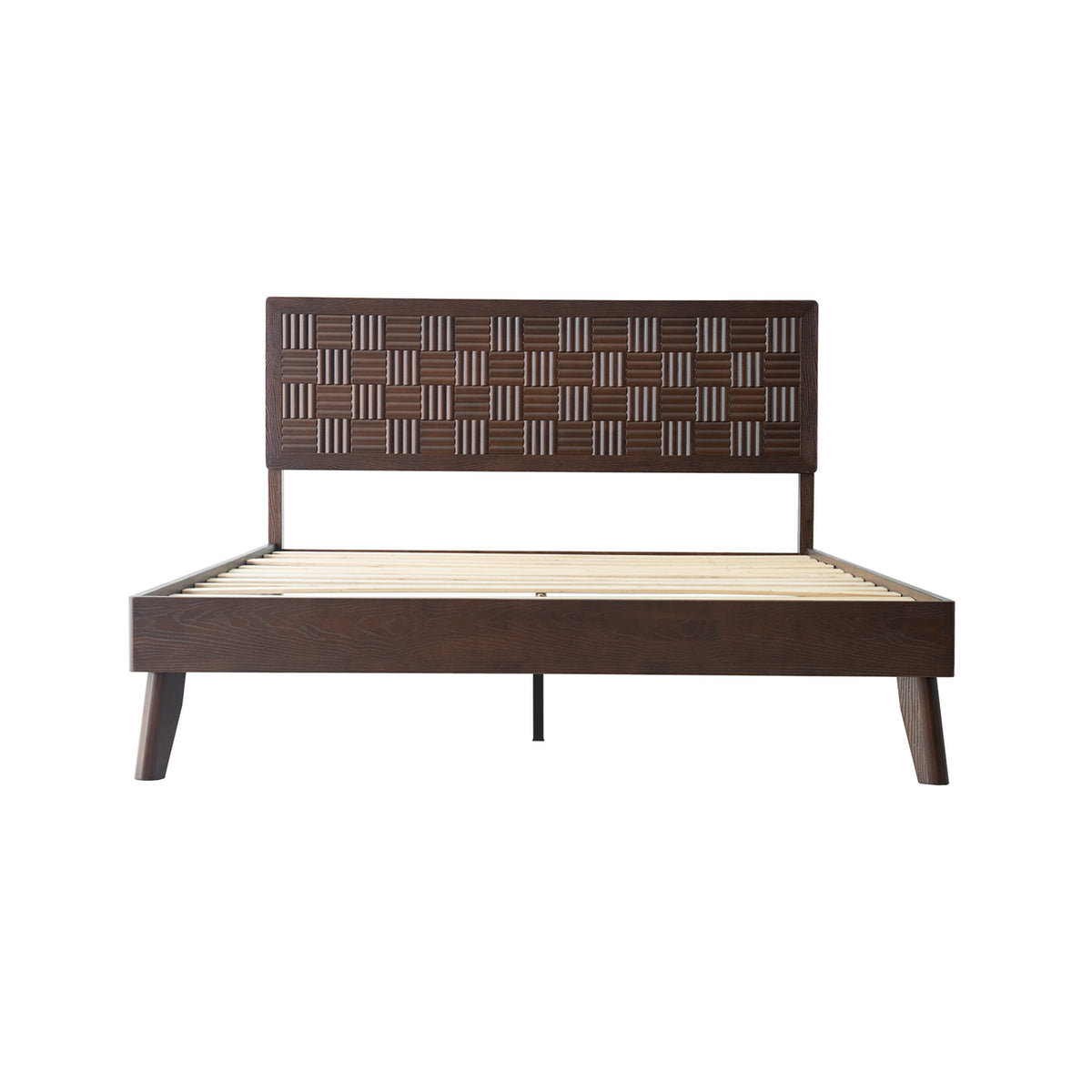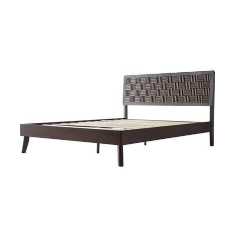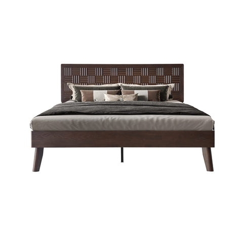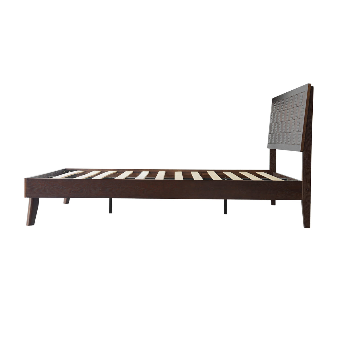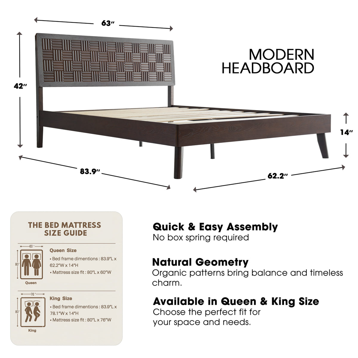 The Idalia Queen Size Bed Frame brings timeless charm and reliable comfort to your bedroom, making it the perfect centerpiece for your space. Expertly crafted from 100% solid wood, it features a rich, Deep Dark Roast Oak finish that highlights the natural beauty of real wood grain. The modern headboard with its Geometric Pattern adds a touch of contemporary flair, while the slightly angled backrest offers cozy support for reading or relaxing after a long day. Designed with a sturdy 12-slat wooden platform reinforced by strong metal support legs, the Idalia Bed delivers lasting stability and a noise-free night’s sleep, no box spring needed. With 8.3 inches of under-bed clearance, you’ll have plenty of space for easy cleaning and extra storage. Every detail, from the smooth finish to the neat screw covers, reflects East West Furniture’s commitment to quality and style. Lightweight yet built to last, the Idalia Bed Frame combines solid wood strength, modern design, and everyday comfort, making your bedroom feel effortlessly elegant and inviting.
