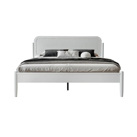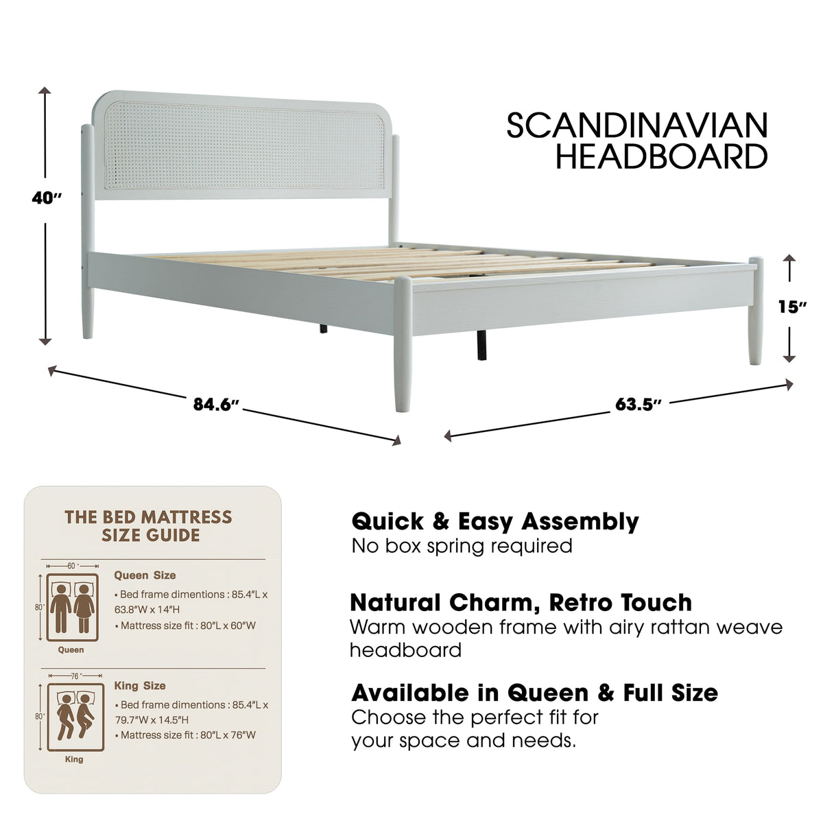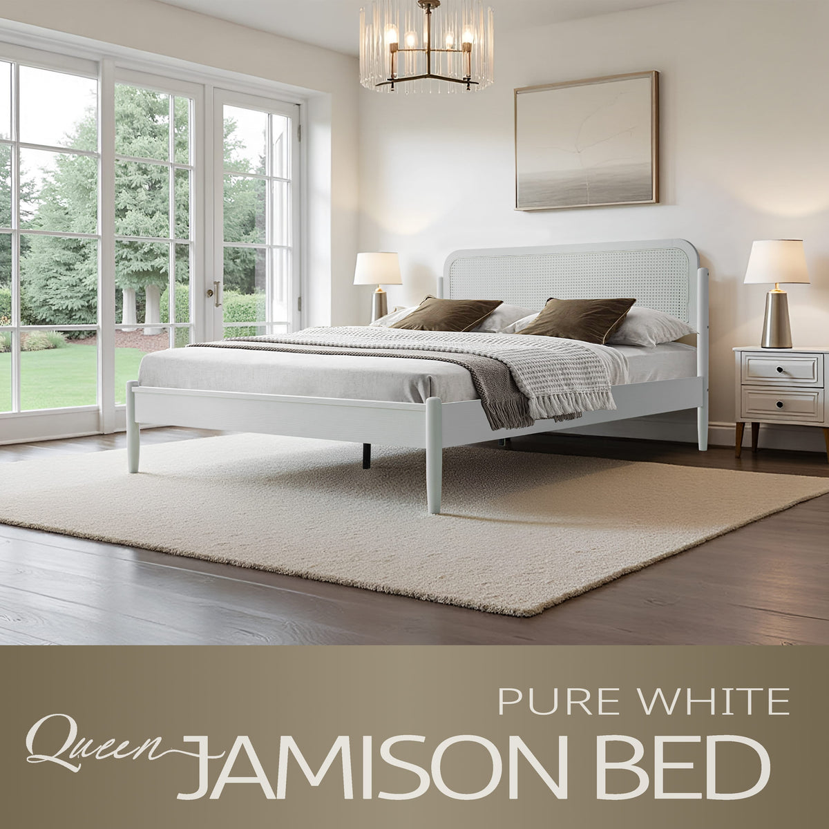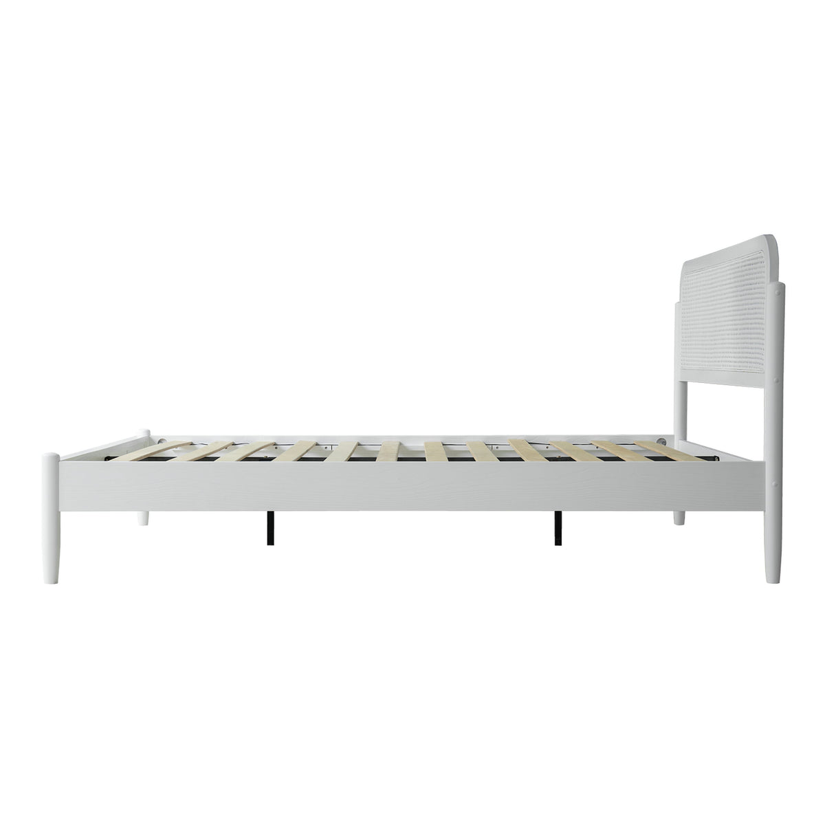 Create a serene and elegant bedroom atmosphere with the Jamison Queen Size Bed Frame by East West Furniture. Expertly made from 100% solid Hevea wood (Rubber wood), this platform bed offers exceptional durability and long-lasting quality. The beautiful Pure White finish adds a clean, fresh, and timeless touch, making it a perfect fit for both modern and classic interiors. Its rattan cane webbing headboard brings a unique texture and a hint of retro charm that enhances any bedroom décor. The Jamison Bed is designed with a 12-strong wooden slatted structure reinforced by sturdy metal center legs, providing superior mattress support and a weight capacity of up to 800 lbs. The slip-free and noise-free design ensures a stable and peaceful sleeping experience every night. With 8.3 inches of under-bed clearance, it offers generous storage space and easy cleaning access. Standing 15 inches high with a 40-inch headboard, this bed delivers both elegance and practicality. No box spring is required, and assembly is quick and simple with tools included. Finished with smooth edges, neat screw covers, and a refined wood texture, the Jamison Bed Frame reflects East West Furniture’s signature craftsmanship and design excellence.