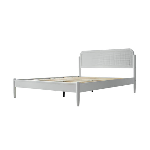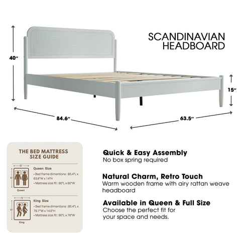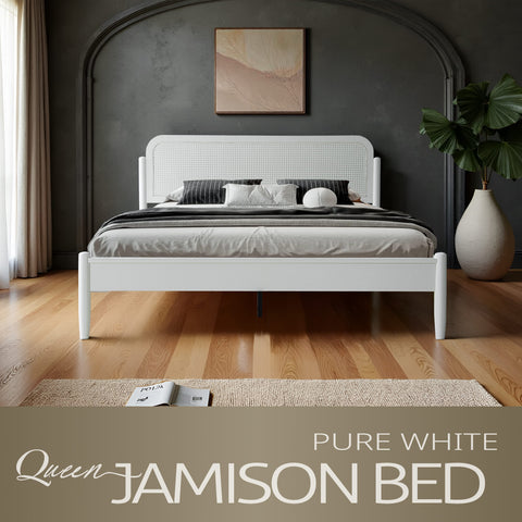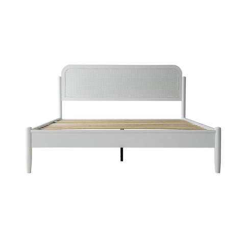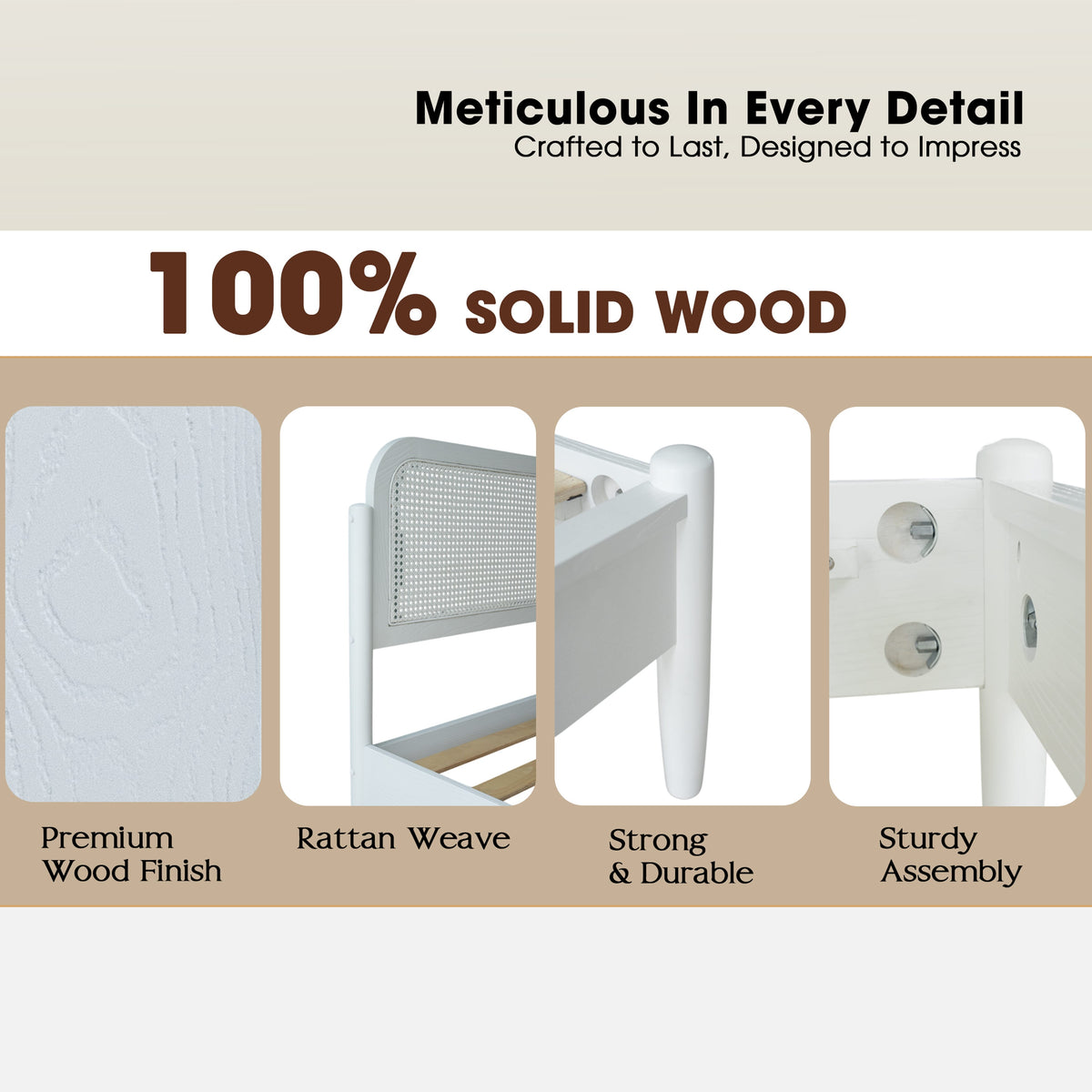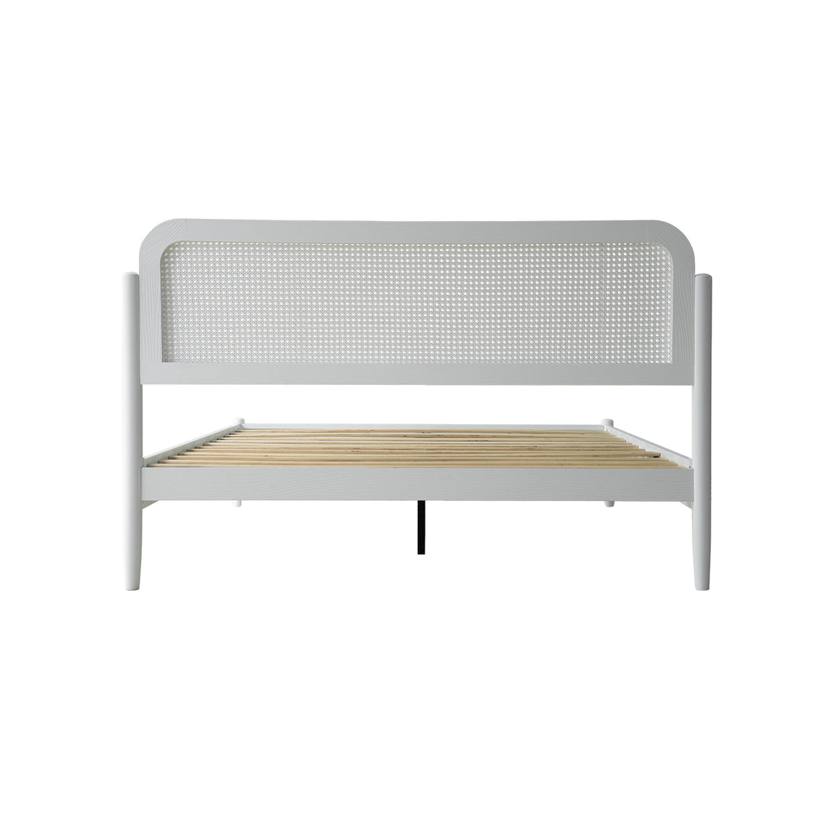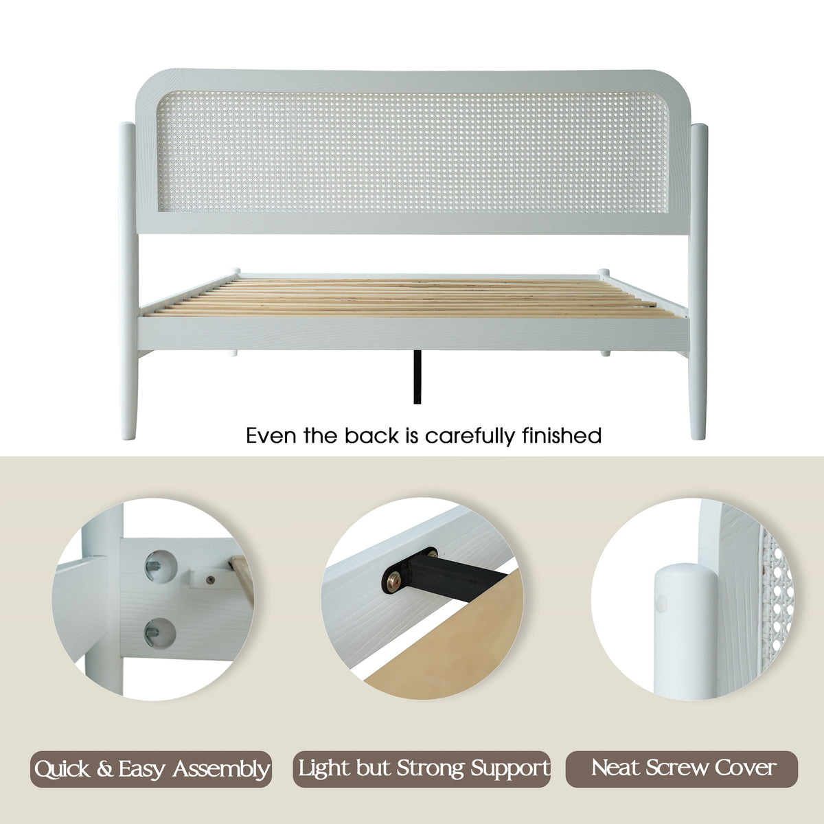 Create a serene and elegant bedroom atmosphere with the Jamison Queen Size Bed Frame by East West Furniture. Expertly made from 100% solid Hevea wood (Rubber wood), this platform bed offers exceptional durability and long-lasting quality. The beautiful Pure White finish adds a clean, fresh, and timeless touch, making it a perfect fit for both modern and classic interiors. Its rattan cane webbing headboard brings a unique texture and a hint of retro charm that enhances any bedroom décor. The Jamison Bed is designed with a 12-strong wooden slatted structure reinforced by sturdy metal center legs, providing superior mattress support and a weight capacity of up to 800 lbs. The slip-free and noise-free design ensures a stable and peaceful sleeping experience every night. With 8.3 inches of under-bed clearance, it offers generous storage space and easy cleaning access. Standing 15 inches high with a 40-inch headboard, this bed delivers both elegance and practicality. No box spring is required, and assembly is quick and simple with tools included. Finished with smooth edges, neat screw covers, and a refined wood texture, the Jamison Bed Frame reflects East West Furniture’s signature craftsmanship and design excellence.