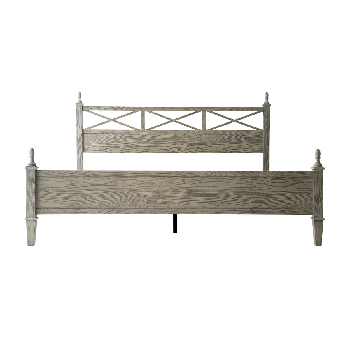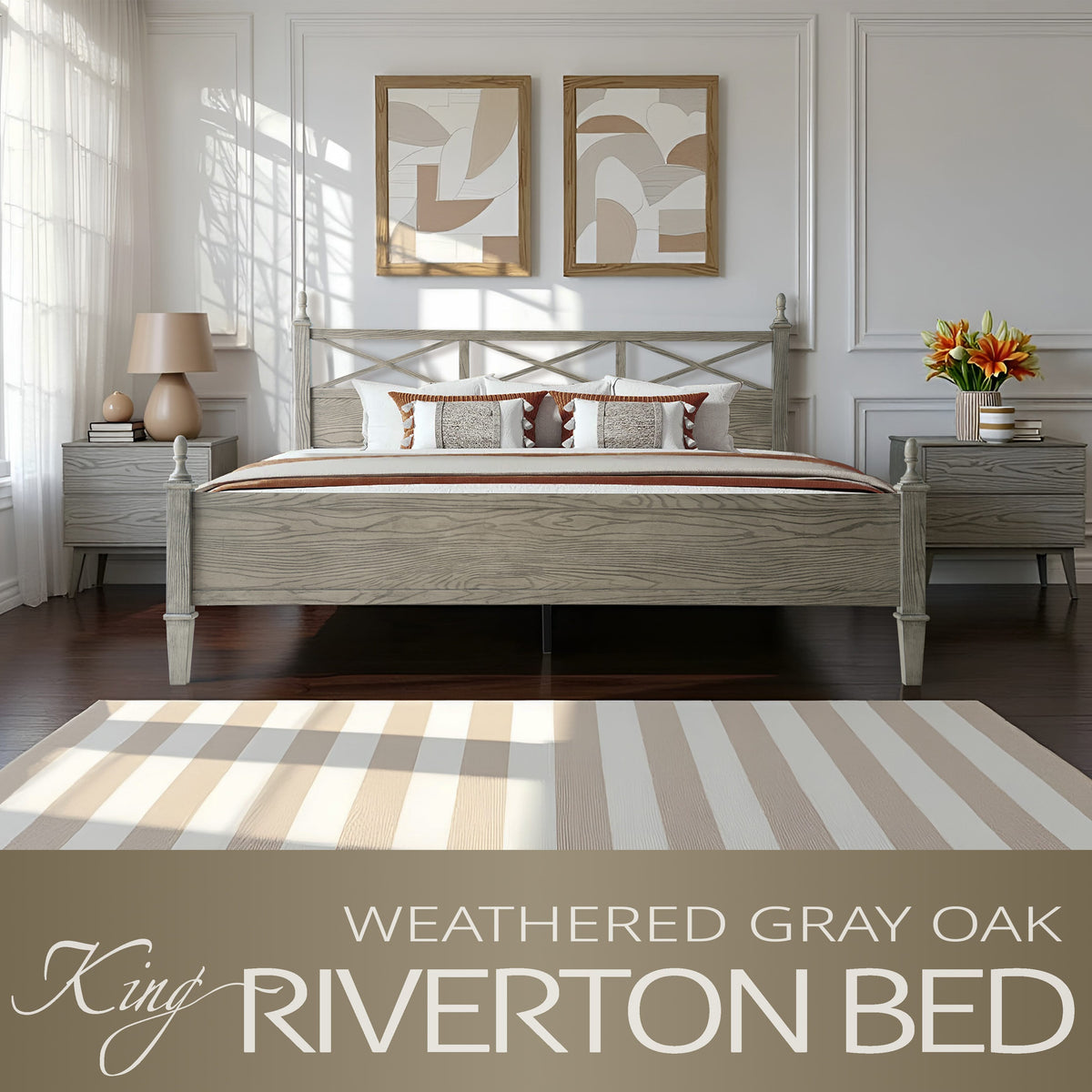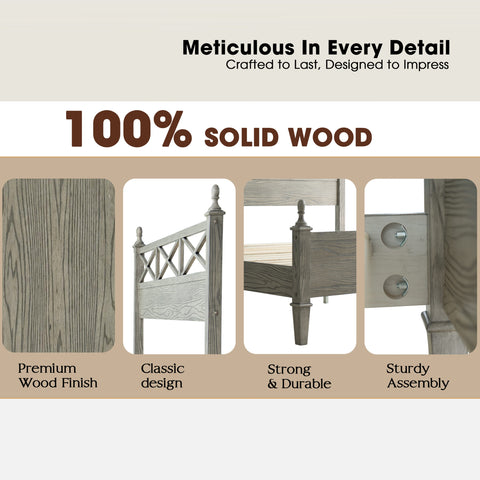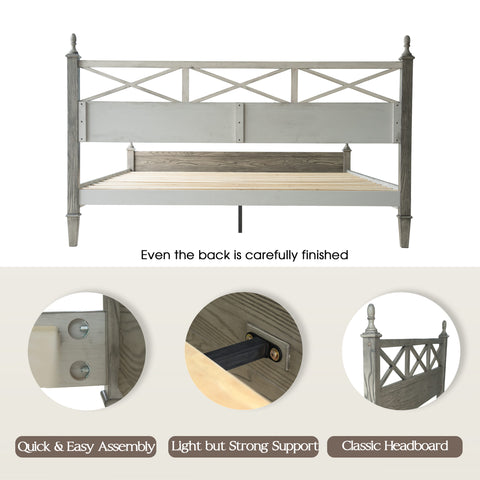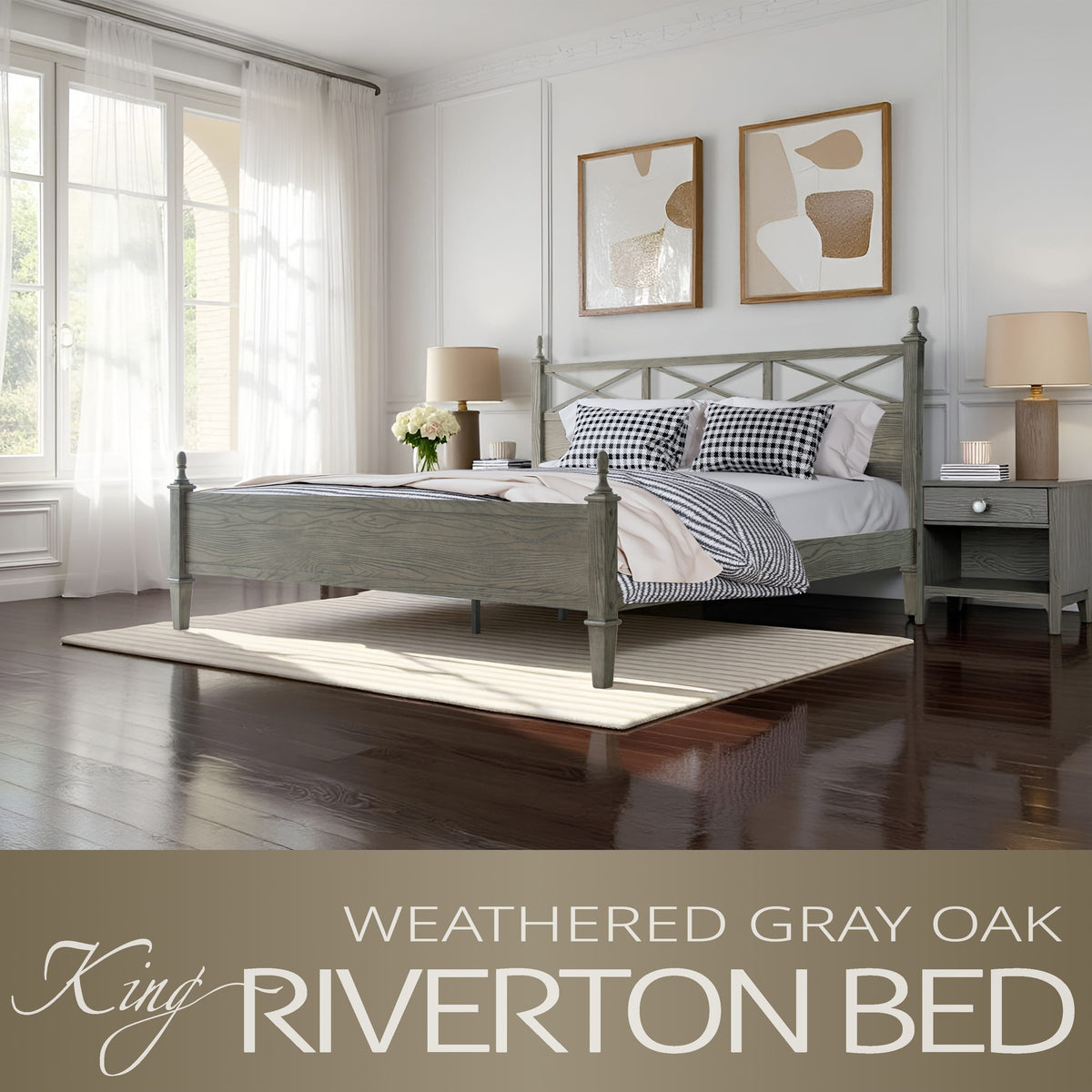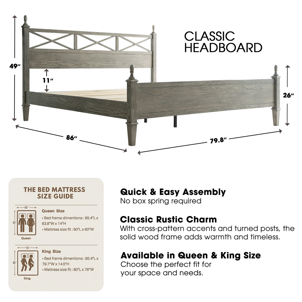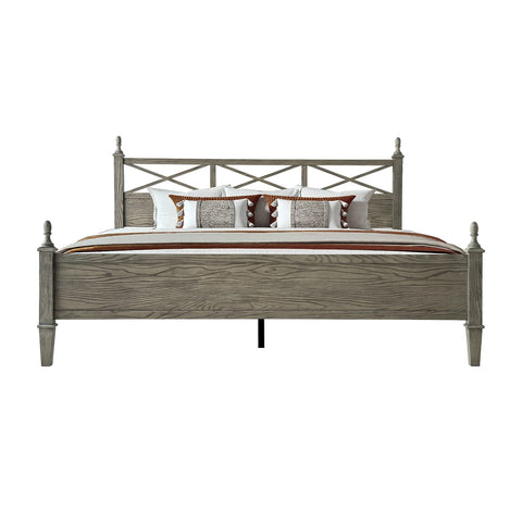 Bring a touch of rustic elegance and enduring quality to your bedroom with the Riverton King Size Bed Frame by East West Furniture. Expertly crafted from 100% solid Hevea wood (Rubberwood), this bed combines durability, functionality, and timeless design. The Weathered Gray Oak finish enhances the natural wood grain, creating a warm and sophisticated atmosphere that complements both classic and modern interiors. The beautifully designed headboard features a cross-pattern detail with turned posts, offering a refined farmhouse look that elevates any bedroom décor. Designed for strength and quiet stability, the Riverton Bed includes 12 durable wooden slats, reinforced metal support legs, and a solid wood frame that ensures a noise-free and slip-resistant foundation - no box spring required. With 8.3 inches of under-bed clearance, it provides ample space for storage or easy cleaning access. Each component - from the finely finished back panel to the smooth, rounded edges - reflects the precision craftsmanship and premium quality that define East West Furniture.