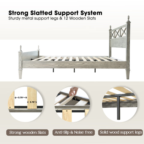 King Size Platform Bed Frame with Solid Wood Headboard & Footboard, 12 Heavy-Duty Slatted, Metal Legs, Anti-Slip & Noise-Free, Easy Assembly, No Box Spring Needed, Weathered Gray Oak Finish, RIK-34
