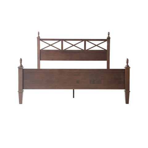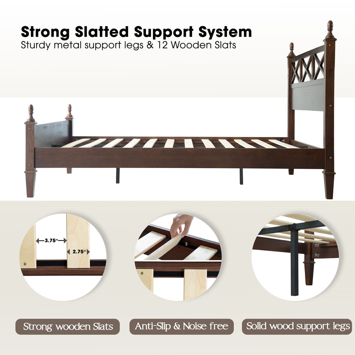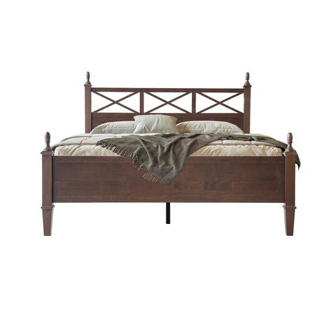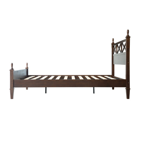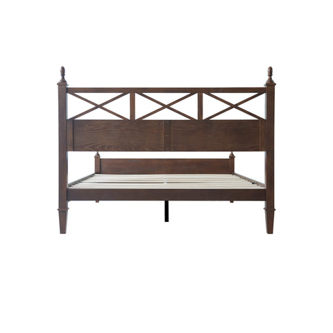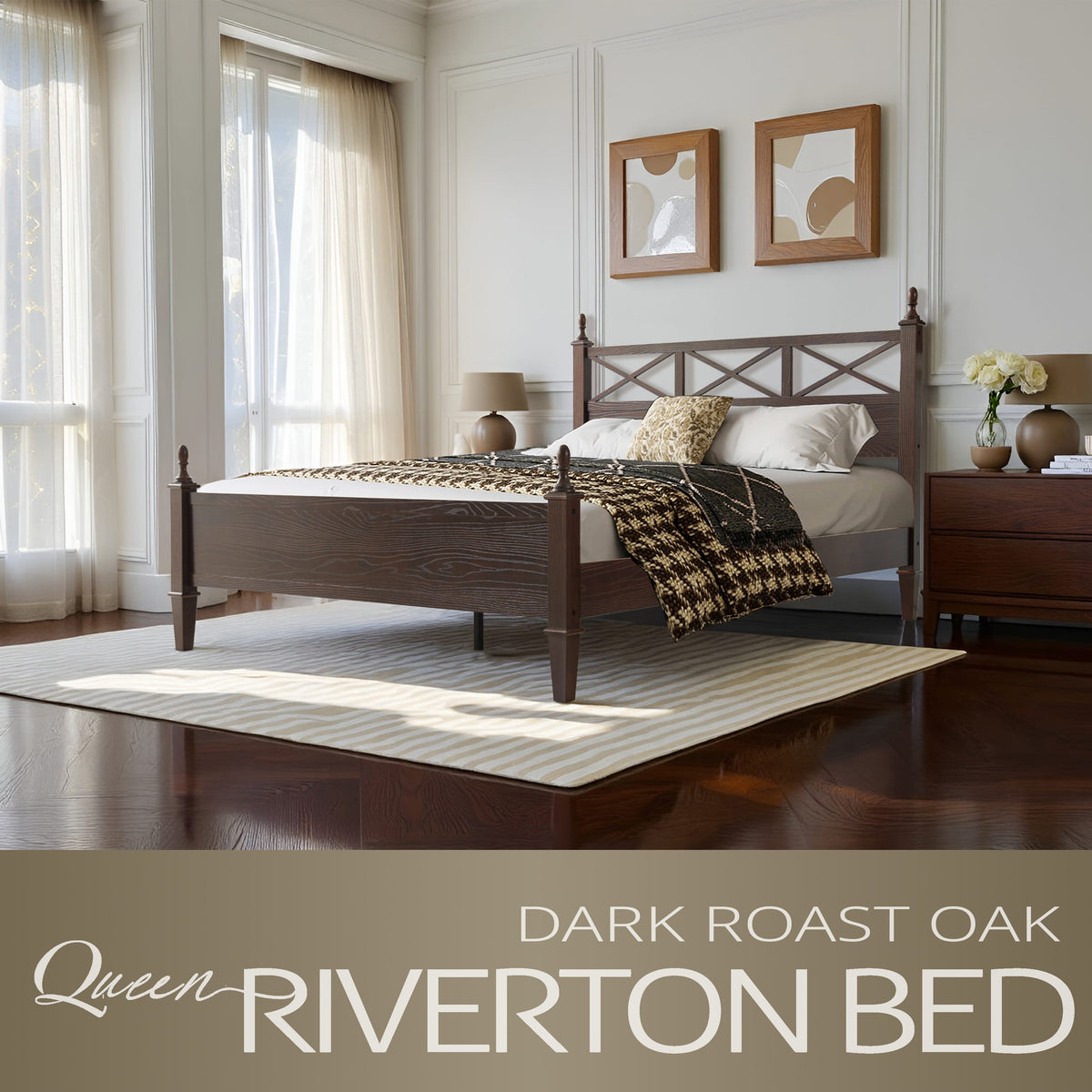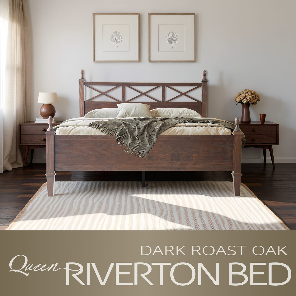 Transform your bedroom with the rustic elegance and lasting appeal of the Riverton Queen Size Bed Frame. Expertly crafted from 100% solid Hevea wood (Rubberwood), this platform bed reflects East West Furniture’s dedication to quality, durability, and timeless design. The Dark Roast Oak finish beautifully highlights the natural wood grain, bringing warmth and sophistication to both modern and traditional interiors. The headboard features a charming cross-pattern design with turned posts, adding a touch of refined farmhouse style to your space. Designed for strength and stability, the Riverton Bed includes 12 durable wooden slats, reinforced metal support legs, and a solid wood frame - providing a sturdy, noise-free, and slip-resistant foundation that ensures peaceful nights and long-lasting use. With 8.3 inches of under-bed clearance, this platform bed also offers practical storage or easy access for cleaning. Every detail - from the smooth edges to the precisely finished back panel - showcases the thoughtful craftsmanship and elegant design that define East West Furniture.
