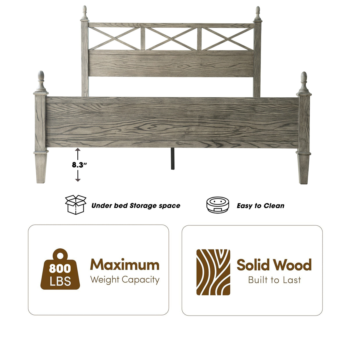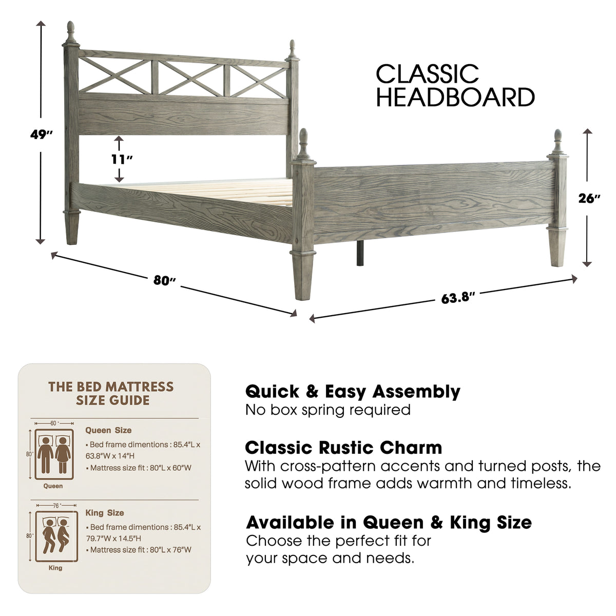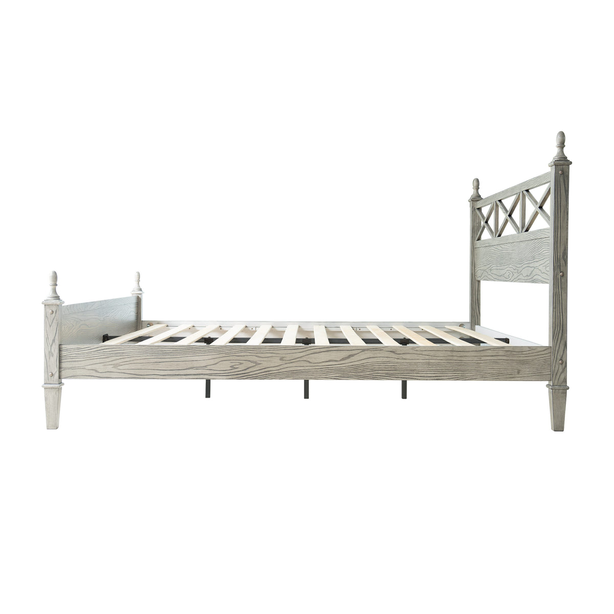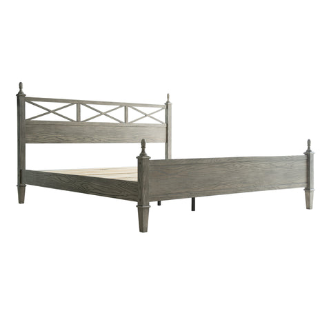 Add rustic charm and modern appeal to your bedroom with the Riverton Queen Size Bed Frame by East West Furniture. Constructed from 100% solid Hevea wood (Rubberwood), this bed delivers both strength and timeless elegance. The Weathered Gray Oak finish beautifully highlights the natural texture of the wood grain, creating a cozy yet sophisticated look that complements a variety of interior styles. The headboard features a cross-pattern design with turned posts, offering a farmhouse-inspired touch with a refined edge. Built for lasting performance, the Riverton Bed includes 12 sturdy wooden slats, reinforced metal legs, and a solid wood structure - ensuring excellent stability and a noise-free, non-slip foundation for restful sleep. Designed with 8.3 inches of under-bed clearance, it provides convenient storage space and easy cleaning access. Every detail, from the smooth edges to the finely finished back panel, reflects East West Furniture’s dedication to craftsmanship, durability, and style.