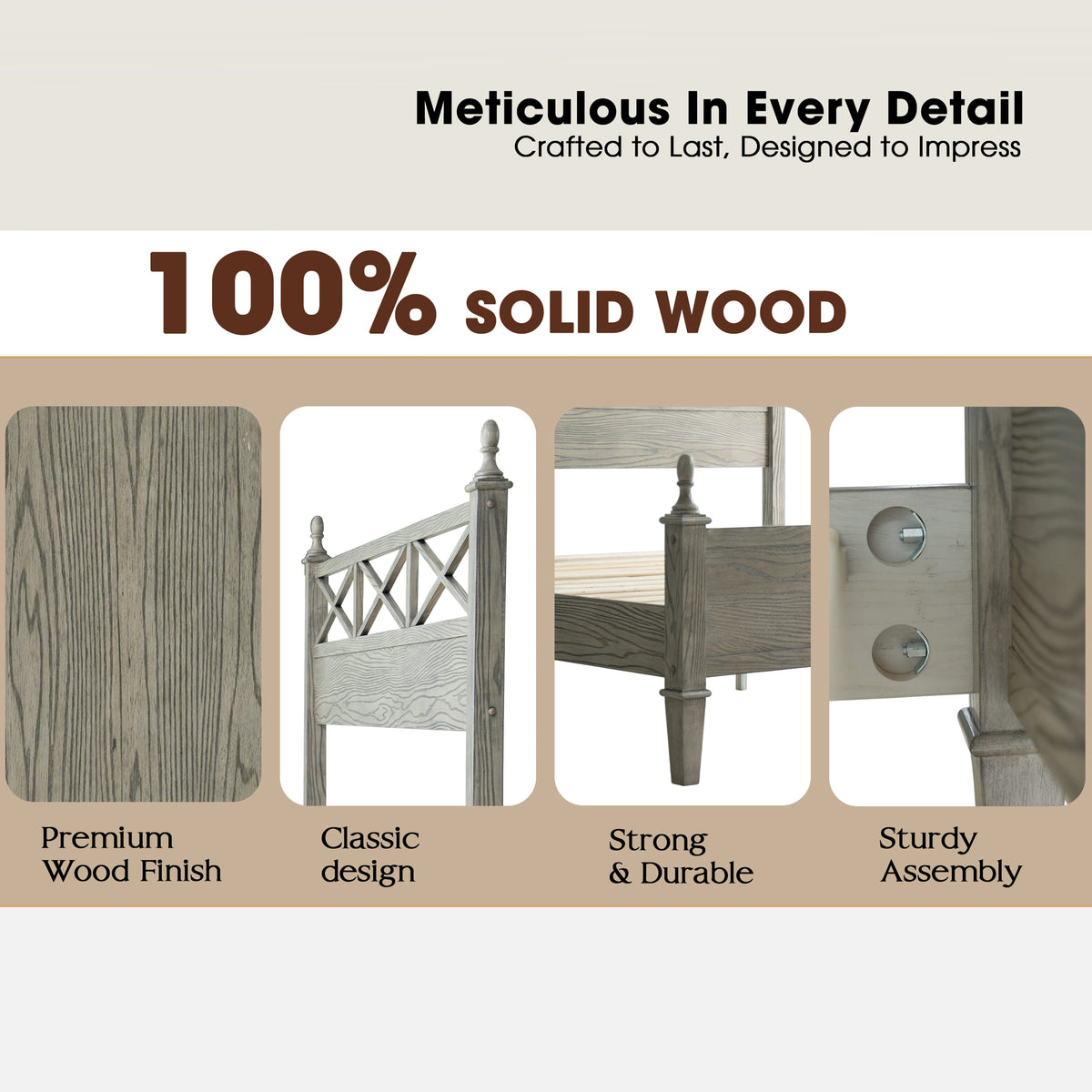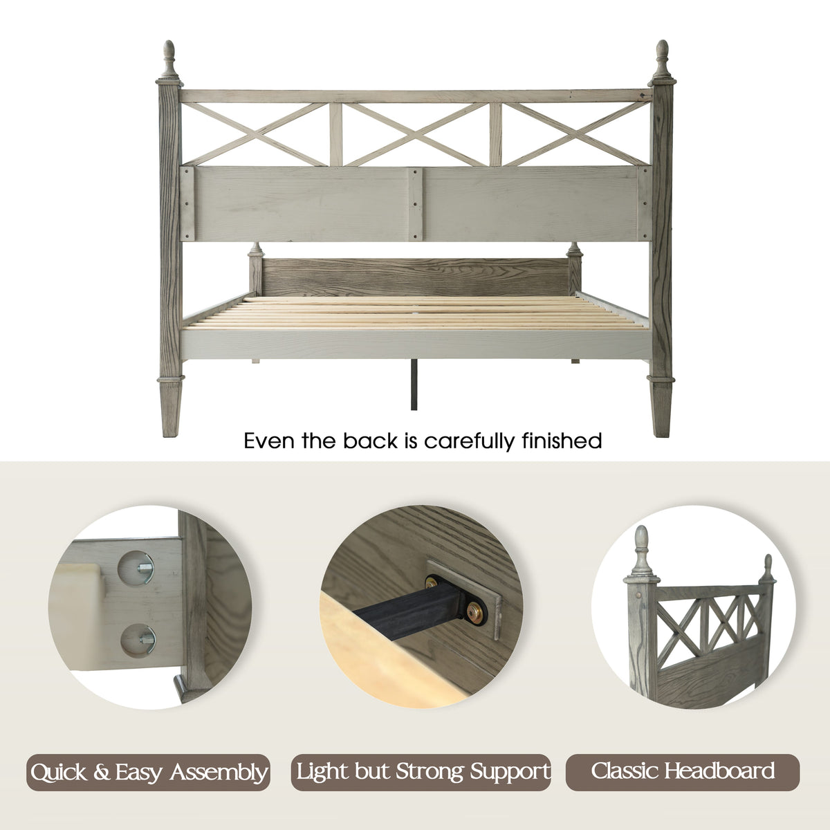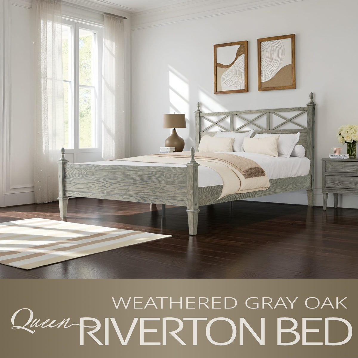 Add rustic charm and modern appeal to your bedroom with the Riverton Queen Size Bed Frame by East West Furniture. Constructed from 100% solid Hevea wood (Rubberwood), this bed delivers both strength and timeless elegance. The Weathered Gray Oak finish beautifully highlights the natural texture of the wood grain, creating a cozy yet sophisticated look that complements a variety of interior styles. The headboard features a cross-pattern design with turned posts, offering a farmhouse-inspired touch with a refined edge. Built for lasting performance, the Riverton Bed includes 12 sturdy wooden slats, reinforced metal legs, and a solid wood structure - ensuring excellent stability and a noise-free, non-slip foundation for restful sleep. Designed with 8.3 inches of under-bed clearance, it provides convenient storage space and easy cleaning access. Every detail, from the smooth edges to the finely finished back panel, reflects East West Furniture’s dedication to craftsmanship, durability, and style.