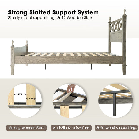 Queen Size Platform Bed Frame with Solid Wood Headboard & Footboard, Metal Legs, 12 Durable Slatted Base, No Box Spring Needed, Easy Assembly, Noise-Free & Anti-Slip, Weathered Gray Oak Finish, RIQ-34
