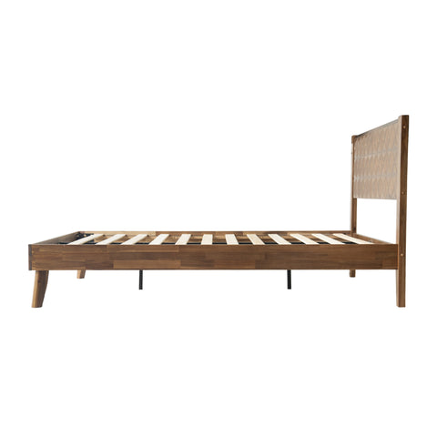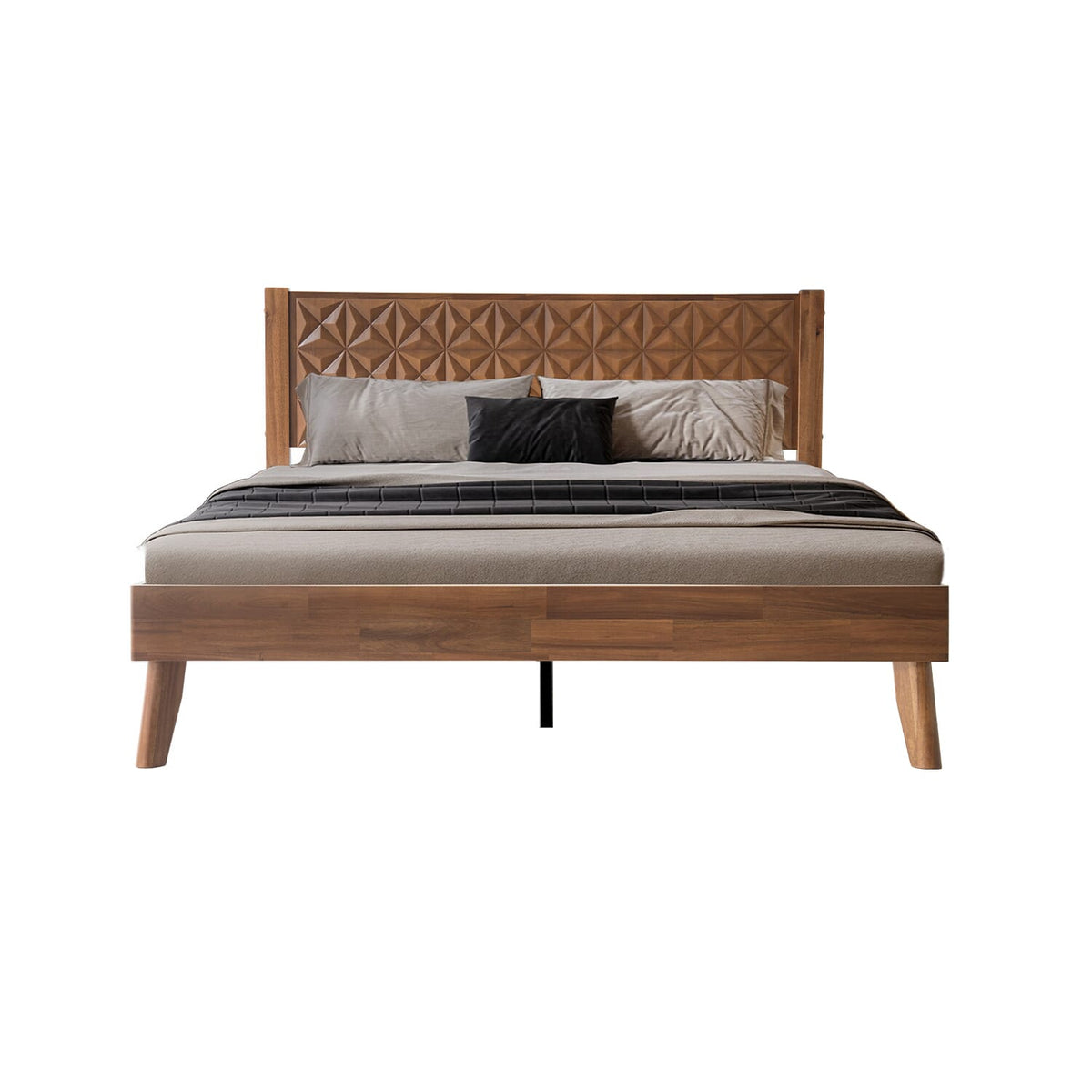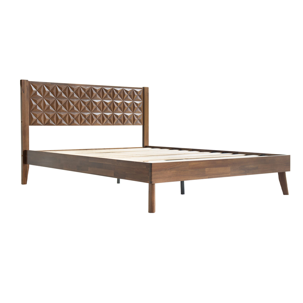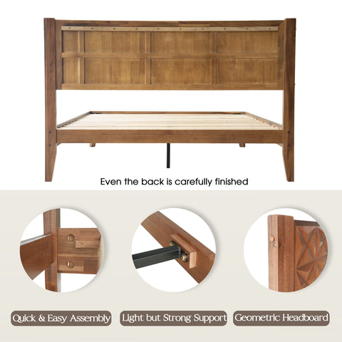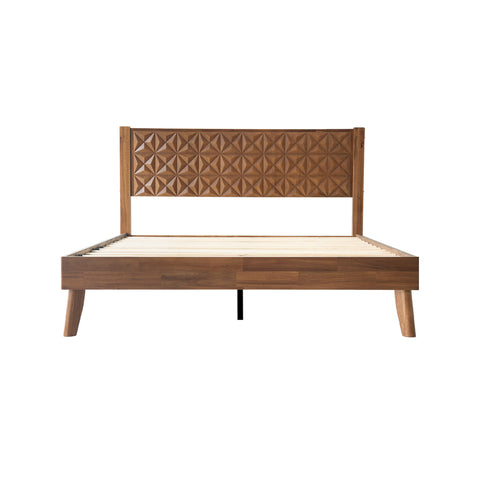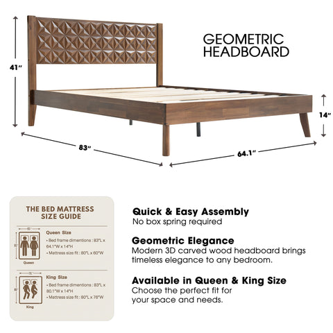 A Queen Size Bed Frame with Geometric Headboard, Footboard, 12-Wooden Slats and Metal Center Legs.