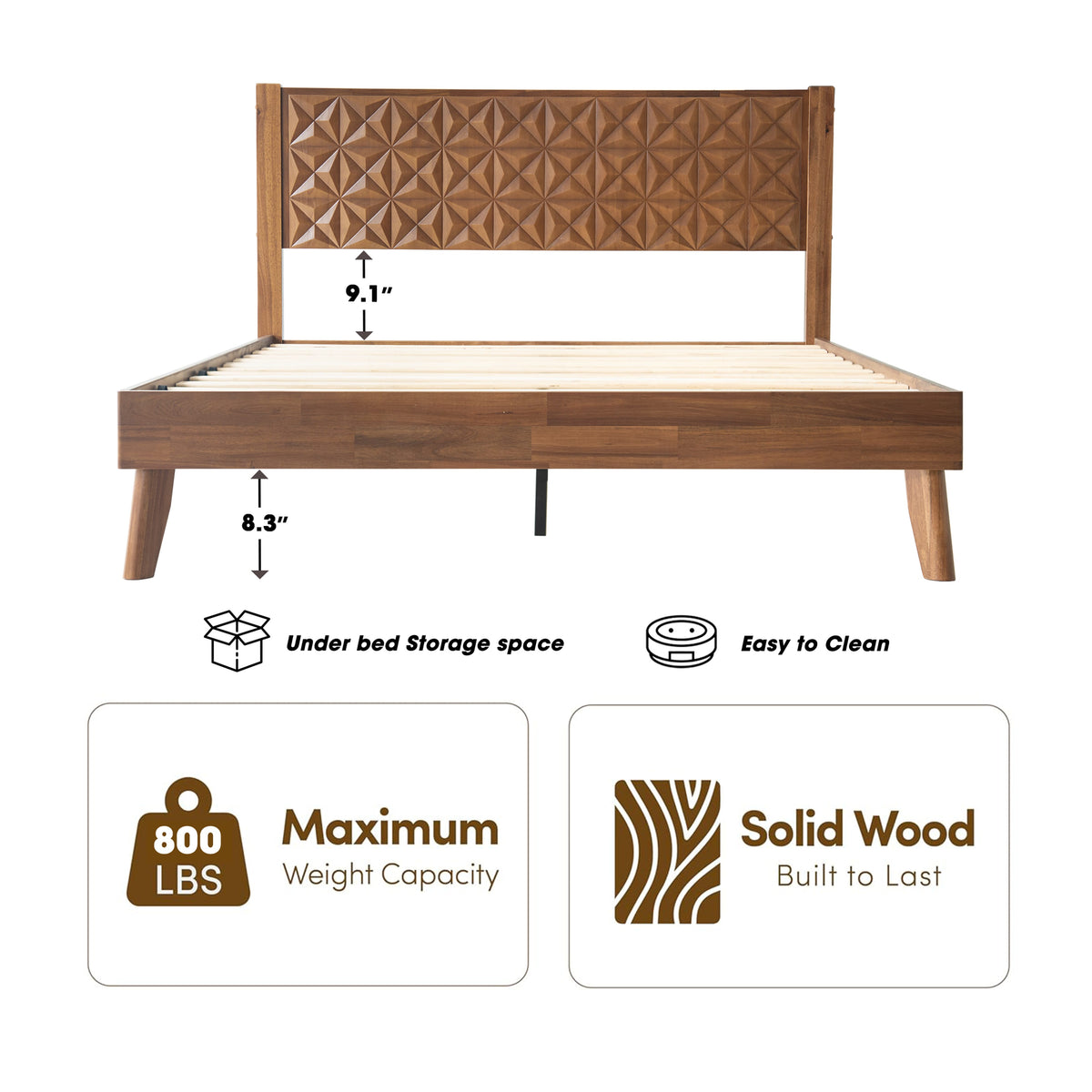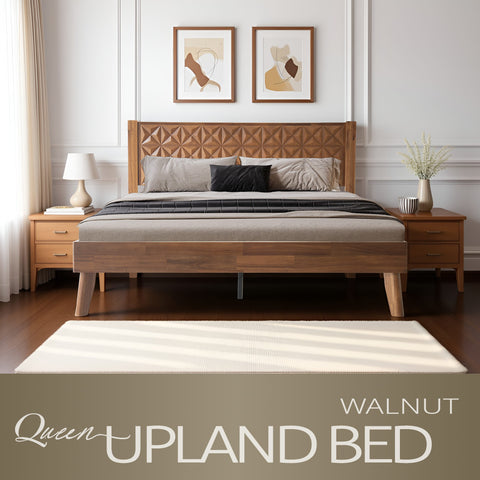 Refresh your bedroom with the Upland Queen Size Bed Frame, a graceful combination of traditional charm and solid craftsmanship. Made from 100% solid wood, this expertly built bed ensures lasting durability and timeless style. The 3D Geometric Carved Pattern headboard and footboard showcase smooth edges and refined detailing that enhance your room’s elegant look. The Walnut finish enriches the natural wood texture, adding depth and luxury to your décor. Built with a 14-inch solid wood platform base, it features 12 sturdy wooden slats and reinforced metal center legs for anti-slip, noise-free support, with no box spring required. With 8.3 inches of clearance beneath, it provides useful storage and easy cleaning. Every element of the Upland Bed, from its polished finish to its strong frame, reflects East West Furniture’s attention to detail and commitment to quality.Quick and easy to assemble, all tools are included for your ease. Experience the beauty and comfort of East West Furniture in your home.