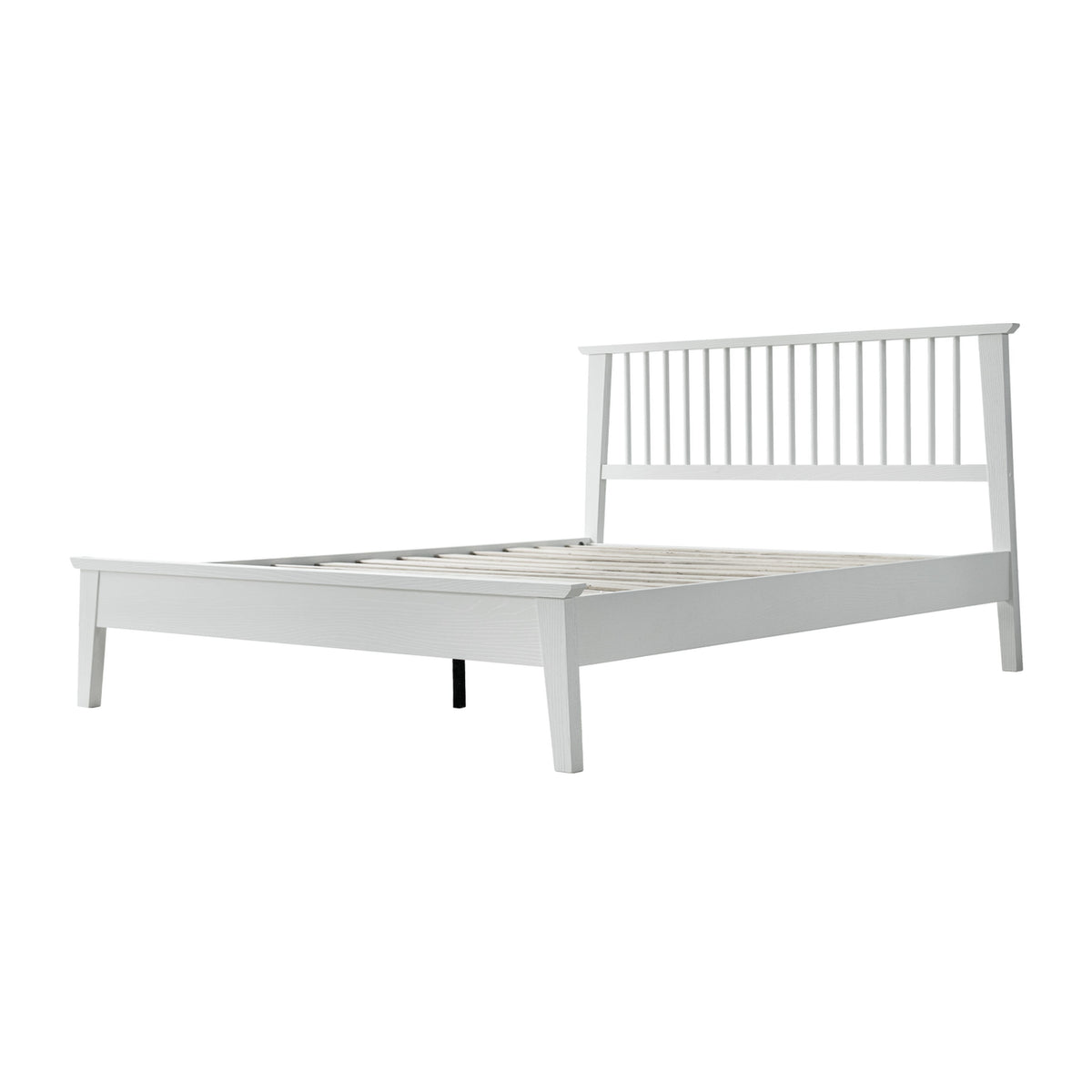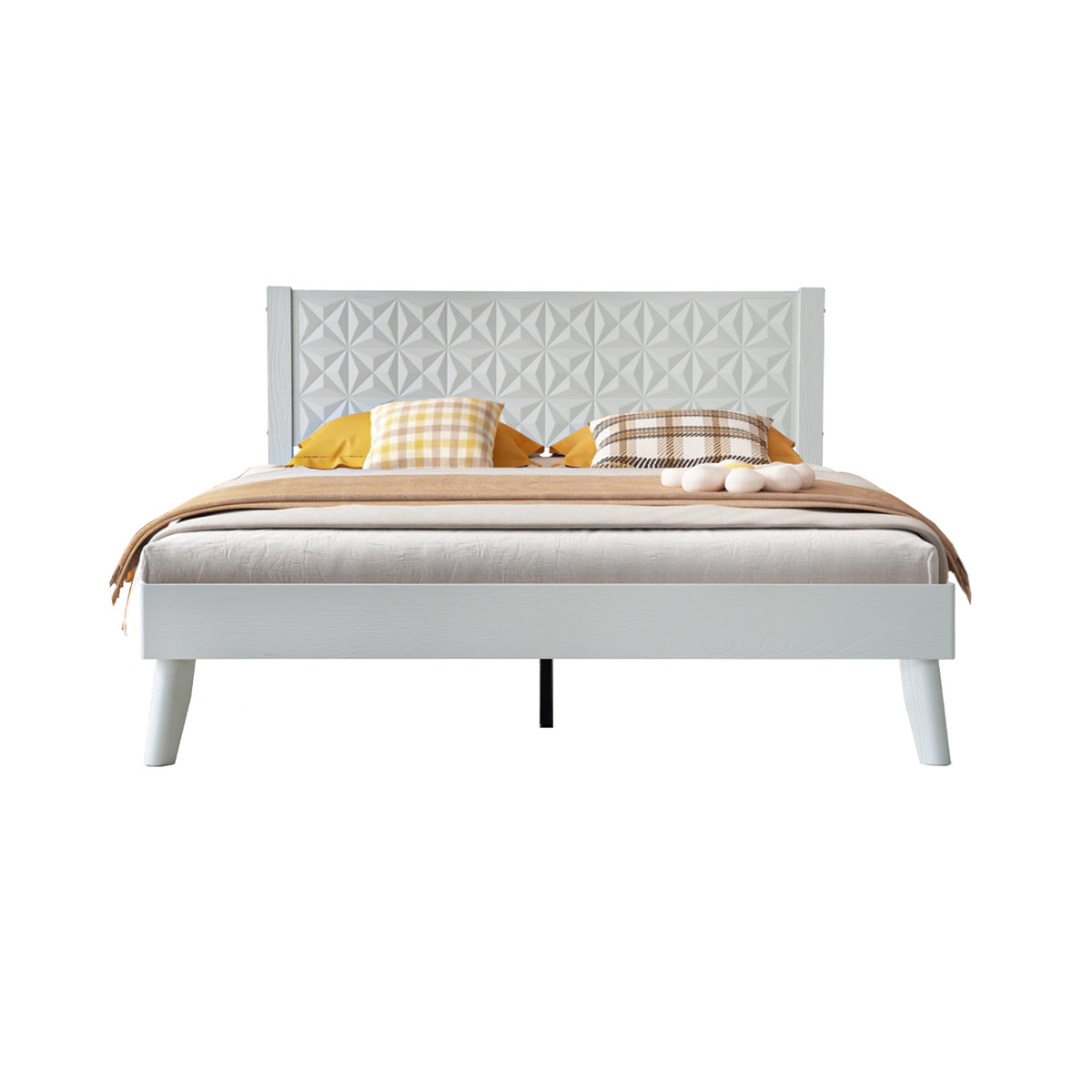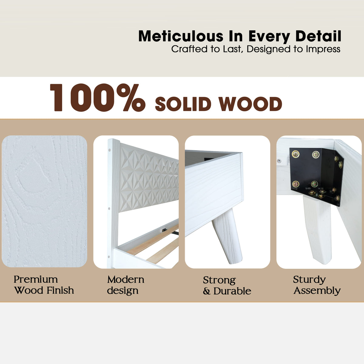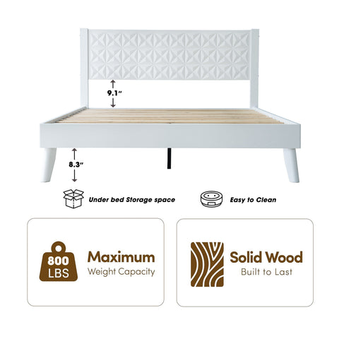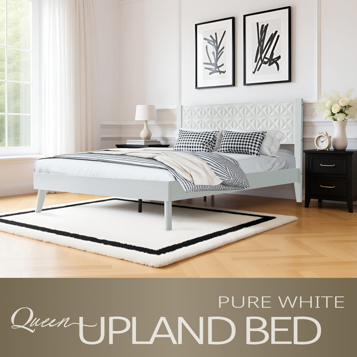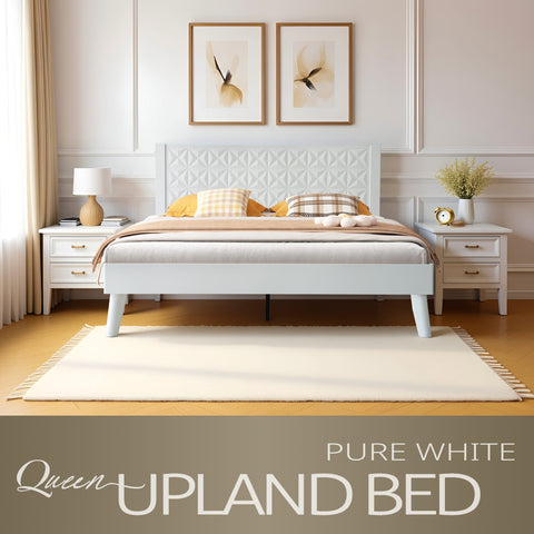 Transform your bedroom with the Upland Queen Size Bed Frame, a flawless mix of rustic beauty and enduring strength. Expertly made from 100% solid wood, this bed delivers reliability and charm that lasts through the years. The 3D Geometric Carved Pattern headboard and footboard display graceful and soft edges that bring a touch of vintage elegance to your room. The Pure White finish beautifully reveals the wood’s natural patterns, creating a warm and cozy atmosphere. Built with a 14-inch solid wood platform base, it features 12 robust wooden slats and reinforced metal center legs for stable, slip-free, and quiet support, no box spring needed. With 8.3 inches of space below, it offers convenient storage and easy upkeep. Every detail of the Upland Bed, from its smooth surface to its solid construction, represents East West Furniture’s promise of quality and fine craftsmanship.