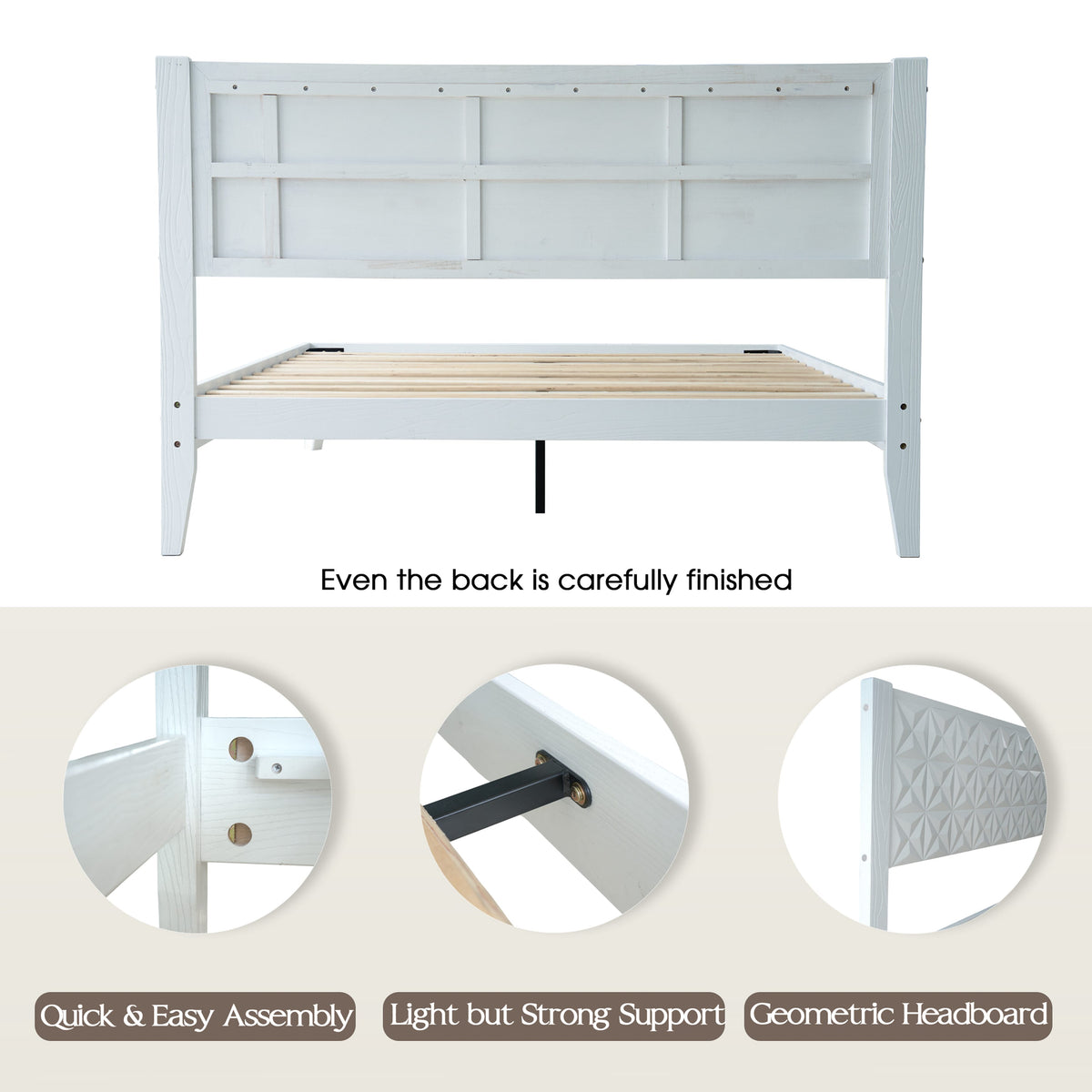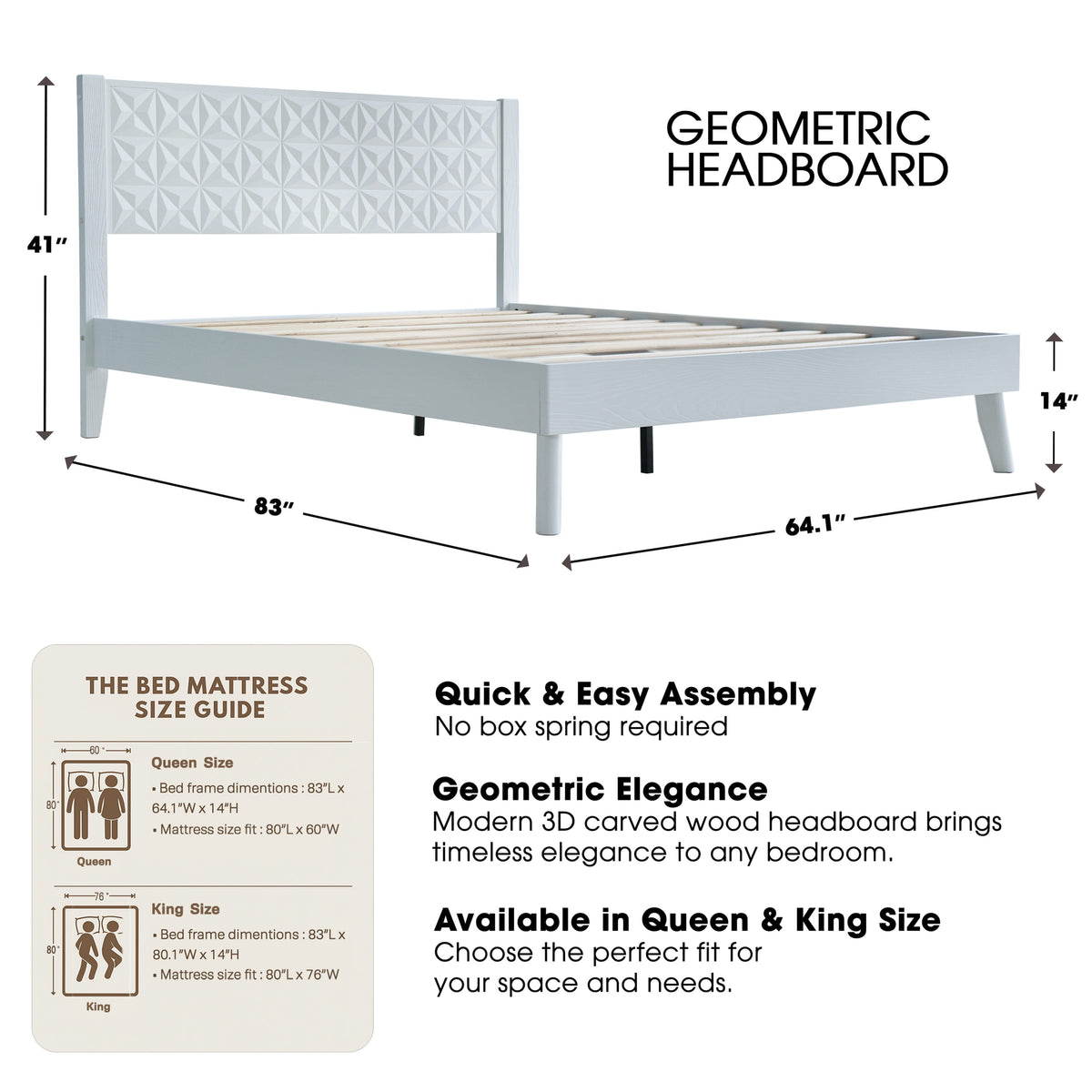 A Queen Size Bed Frame with Geometric Headboard, Footboard, 12-Wooden Slats and Metal Center Legs.