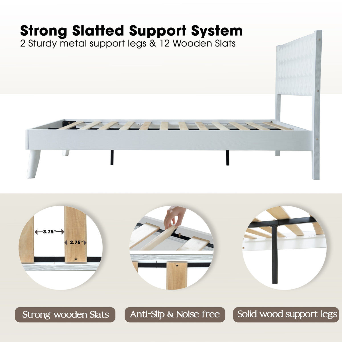 Queen Size Solid Wood Platform Bed Frame with Headboard & Footboard, Central Metal Legs, 12 Sturdy Slats, Noise-Free & Anti-Slip Design, Easy Assembly, No Box Spring Needed, Pure White Finish, UPQ-39